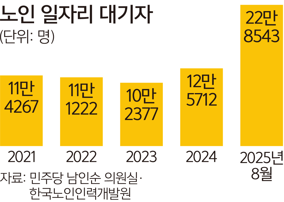 노인일자리 대기자는 2020년 8만6046명, 2021년 11만4267명, 2022년 11만1222명, 2023년 10만2377명, 2024년 12만5712명으로 꾸준히 늘어난 데 이어 올해는 지난해 대비 2배 가까이 급증했다. 노인일자리 참여자도 2020년 73만7708명에서 올해 99만7233명으로 늘어났지만, 노인 인구가 급증하면서 신청자가 더 빠르게 늘어난 것이다. 노인일자리 신청자는 2020년 82만3754명에서 올해 122만5776명으로 40만명(48.8%) 증가했다.