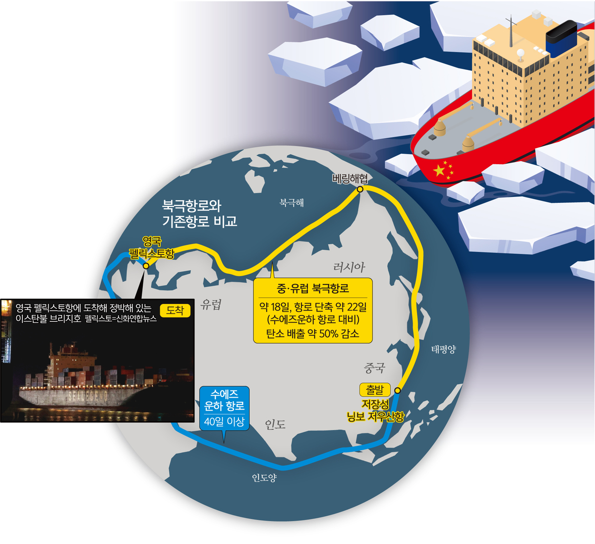 중국 화물선이 북극 항로를 통해 20일 만에 영국 항구에 도착했다. 동아시아와 유럽을 연결하는 북극 항로가 열린 것은 이번이 처음으로, 현지에서는 ‘빙상 실크로드’의 새로운 장을 열었다는 평가가 나온다.