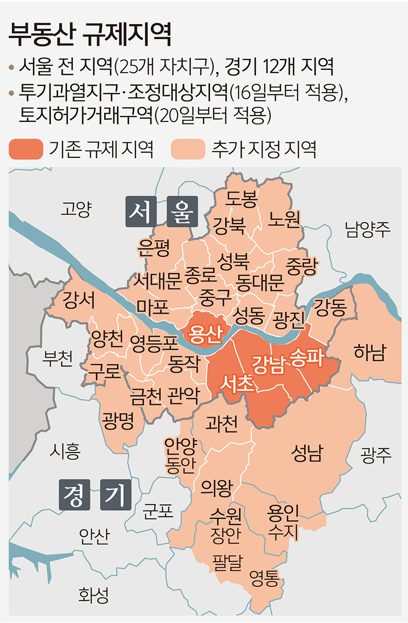 정부는 15일 기존 규제지역인 서울 강남 3구(강남·서초·송파)와 용산구 등 4곳의 규제지역을 유지하면서 서울 나머지 21개 구와 과천·광명·성남 분당 등 경기 지역 12곳을 조정대상지역·투기과열지구로 지정했다. 윤석열정부 시절이던 2023년 1월 강남 3구와 용산구를 제외한 수도권 전 지역의 부동산 규제가 전면 해제되기 이전으로 복귀한 것이다.