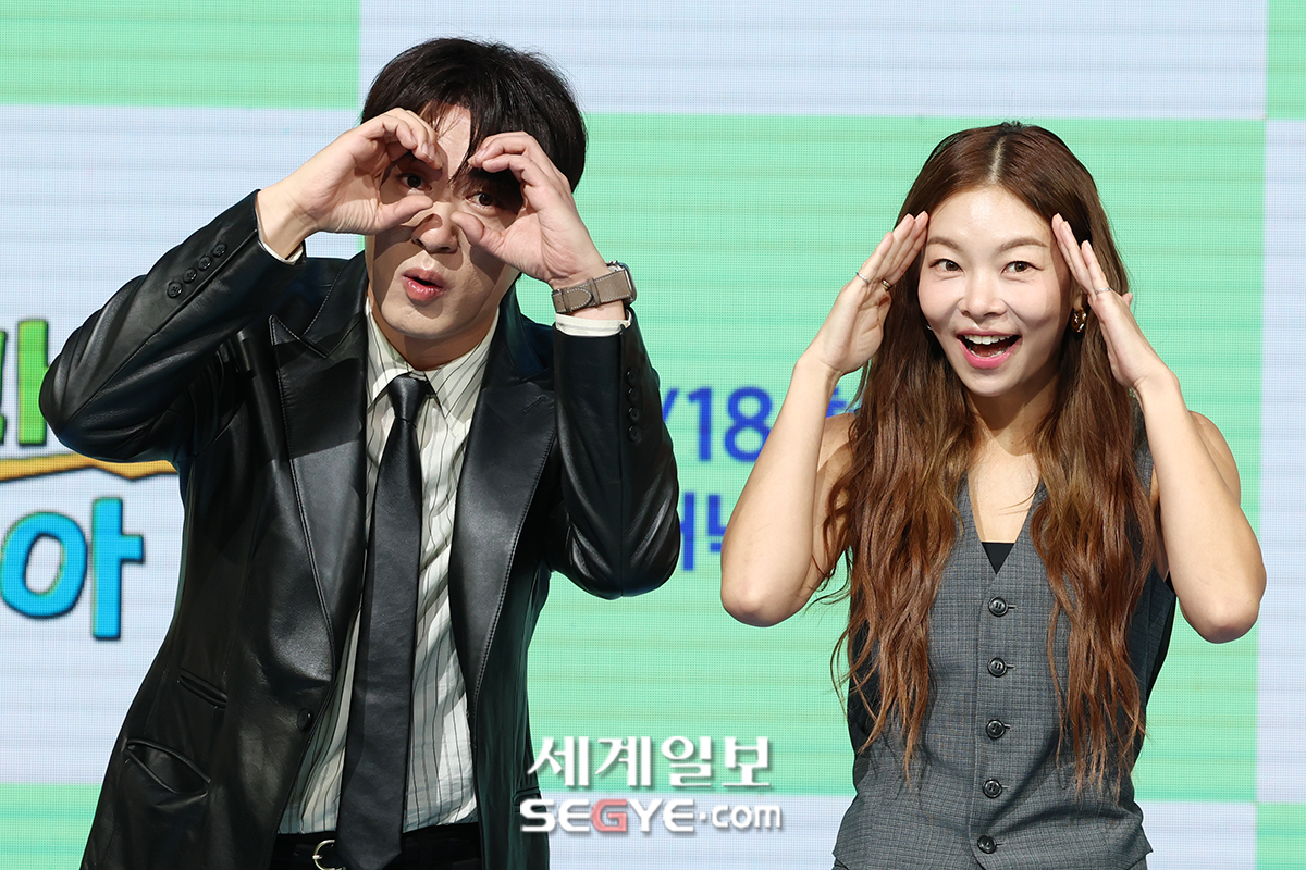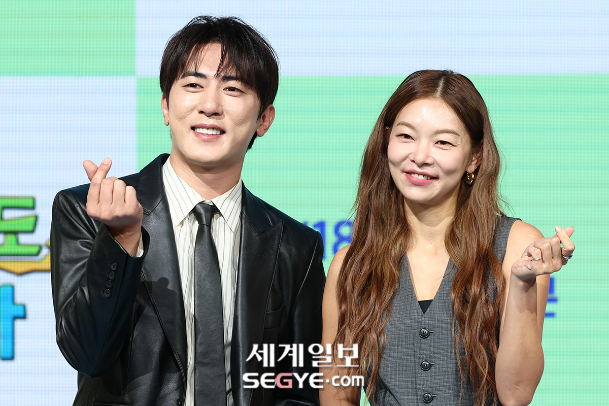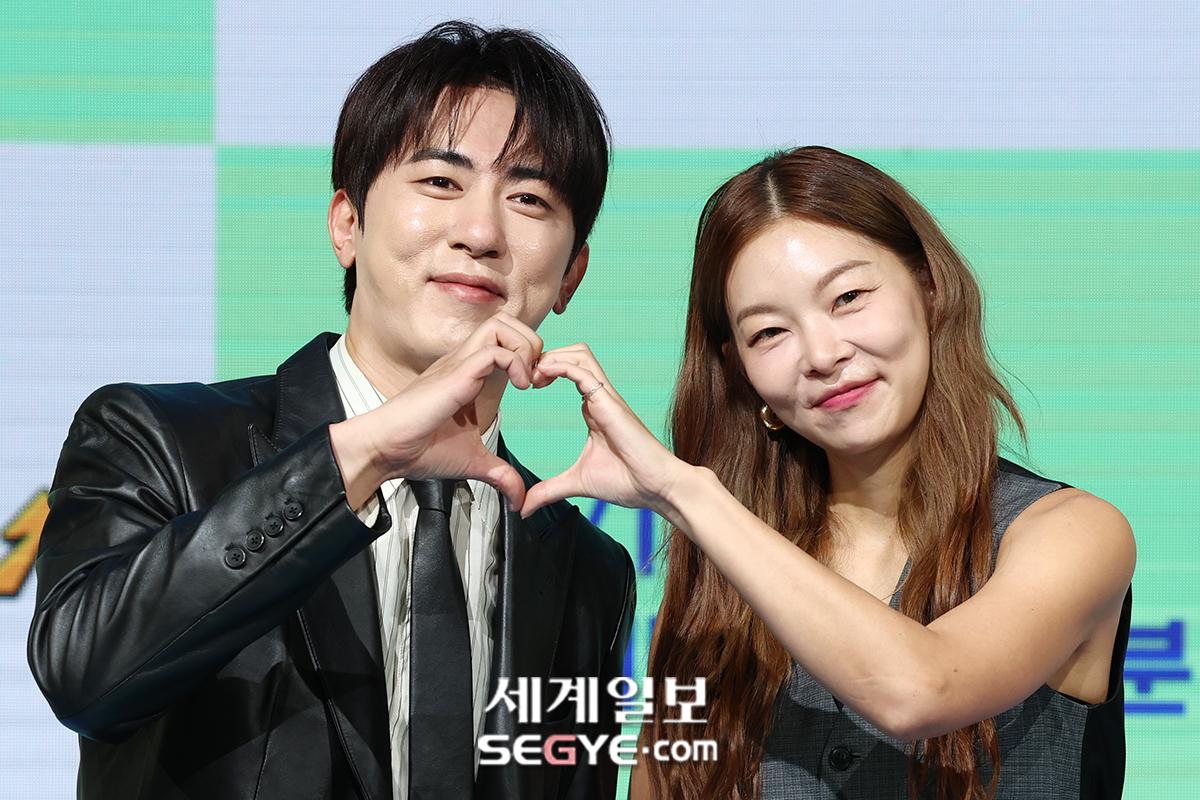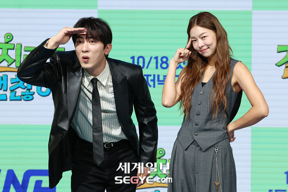 코미디언 김원훈(사진 왼쪽)과 방송인 송해나가 16일 서울 마포구 상암동 쇼킹케이팝센터에서 열린 ENA ’길치라도 괜찮아’의 제작발표회에 참석해 포즈를 취하고 있다.