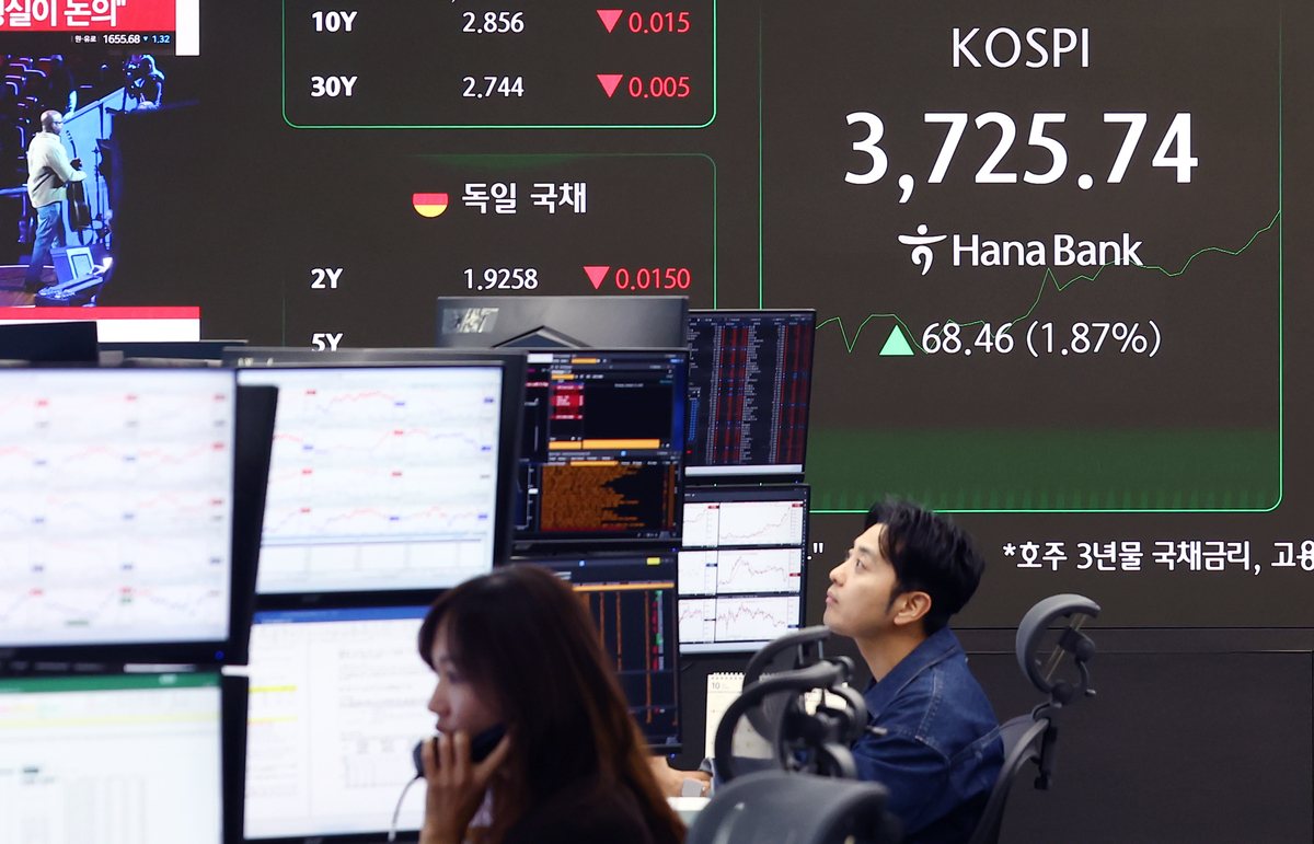 이날 오전 11시 15분 현재 코스피는 전장보다 63.51포인트(1.74%) 오른 3,720.79를 나타내고 있다.