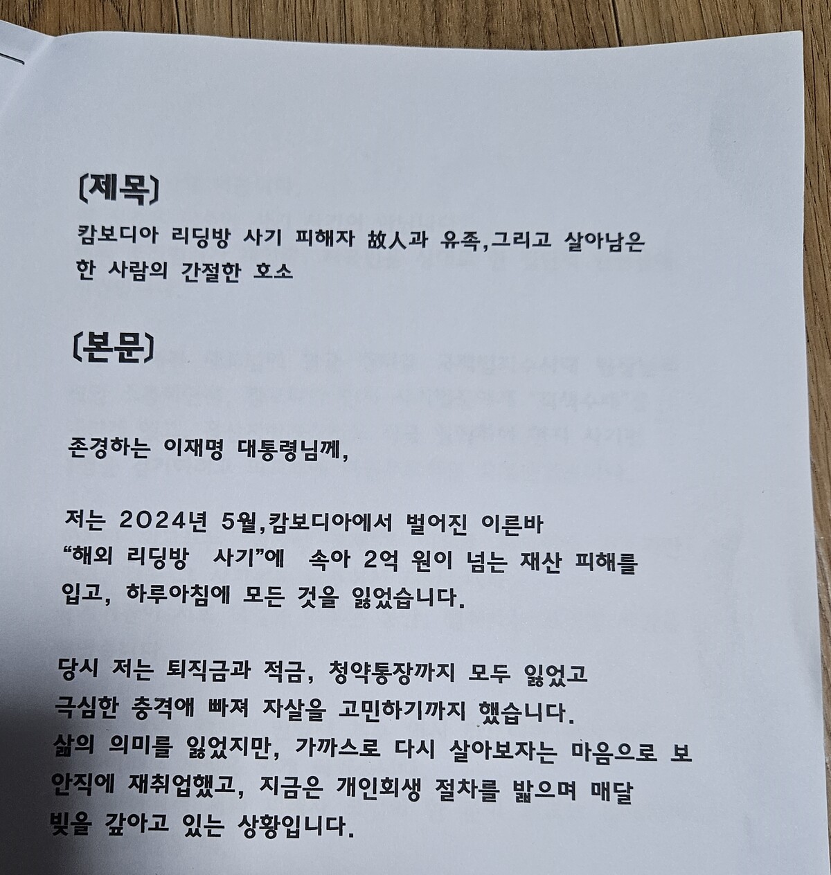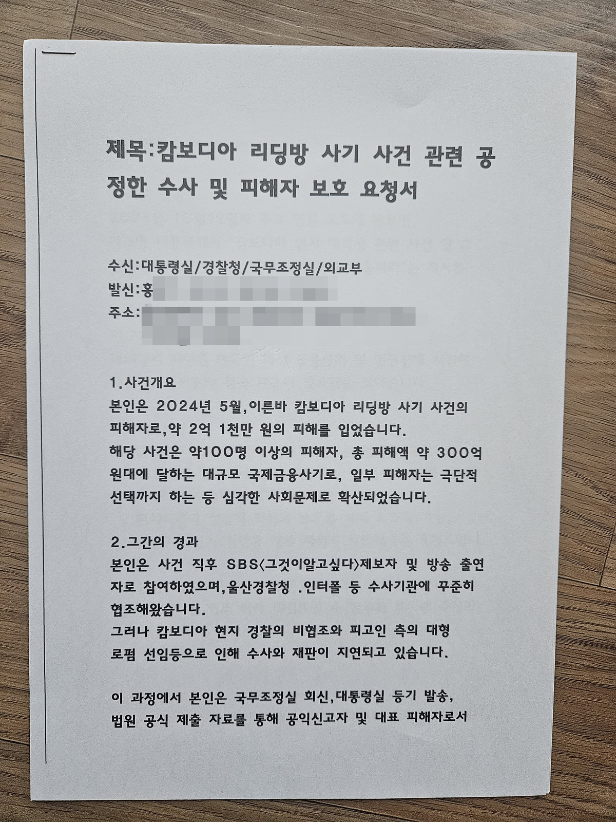 두 사람은 현지 파견된 법무부 등 수사관들에 의해 다시 체포됐지만 송환 절차는 9개월째 제자리다. 현지 사법 절차가 불투명하고, 일부에서는 “캄보디아 내 반정부인사와의 교환 문제로 지연되고 있다”는 이야기도 나온다. 피해자들은 대통령실·외교부·법무부·정당에 수 차례 탄원서를 냈지만 진전은 없다.