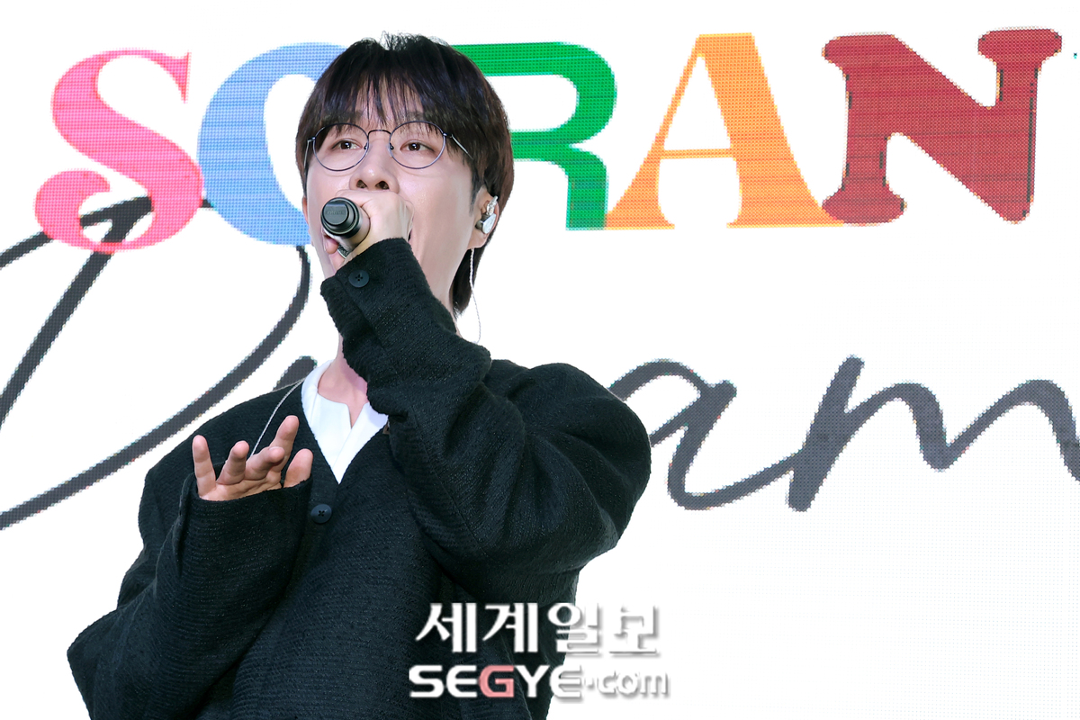 밴드 소란의 고영배가 16일 서울 마포구 창천동 엠피엠지 사옥에서 열린 EP ‘DREAM’ 첫 공식 쇼케이스에 참석해 열띤 공연을 펼치고 있다.
