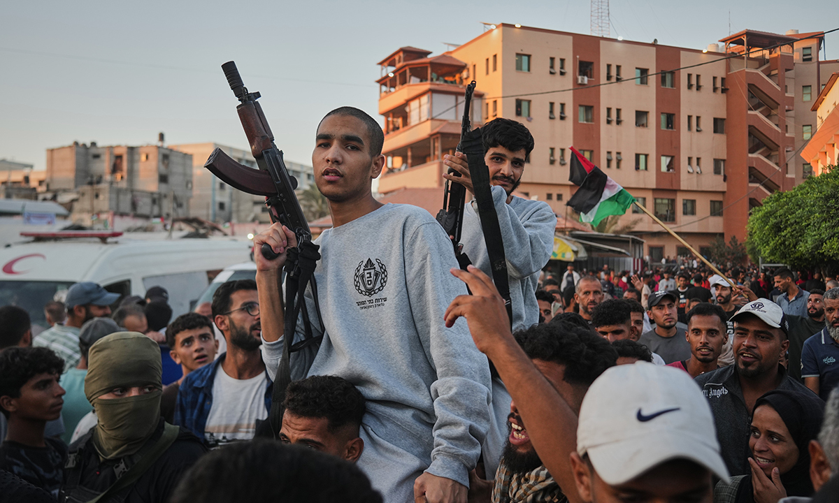 이스라엘 교정 당국으로부터 석방된 팔레스타인 포로들이 13일(현지시간) 가자지구 남부 칸유니스 나세르 병원 인근에 도착하고 있다. 이는 이스라엘과 팔레스타인 무장 정파 하마스가 체결한 ‘1단계 휴전’ 합의에 따른 것이다. 주민들은 상기된 표정으로 이들의 무사 귀환을 축하하고 있지만, 자유를 되찾은 포로들의 손에는 총이 들려 있다. 이스라엘과 하마스가 15일 추가 협상 절차에 착수하면서 도널드 트럼프 미국 대통령이 제안한 가자지구 평화 구상의 ‘2단계 협상’이 시작됐다. 그러나 하마스 무장 해제와 가자지구의 전후 통치 방식을 둘러싼 이견이 여전해 협상에 난항이 예상된다.
