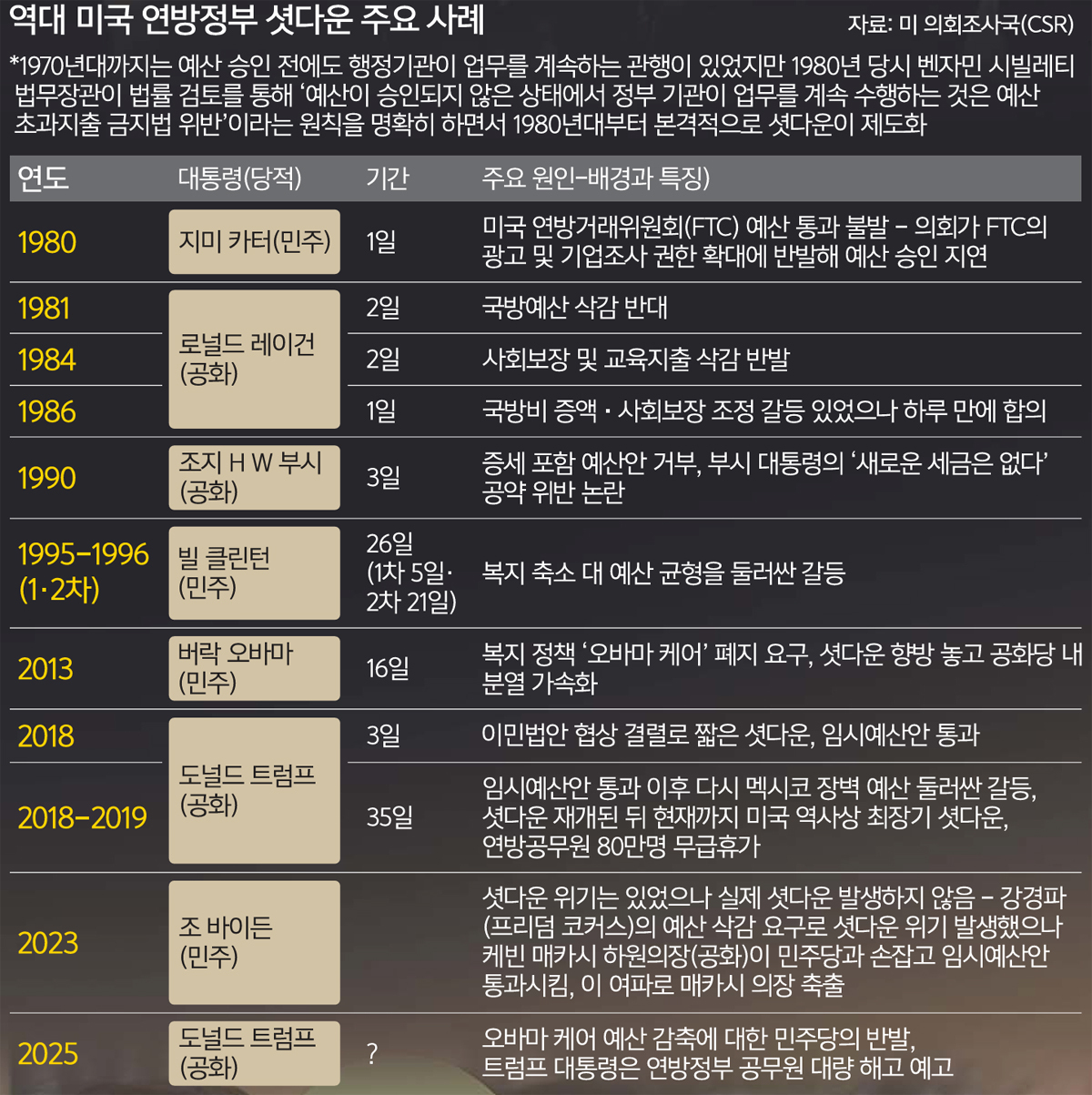 미 의회가 9월30일(현지시간) 회계연도 종료 전에 예산안을 통과시키지 못하면서 미국 연방정부는 지난 1일 6년 만에 셧다운(일시적 업무정지)됐다. 연방 하원은 정부 운영을 11월21일까지 임시 유지하는 결의안을 통과시켰지만 상원은 연일 임시예산안을 통과시키지 못하고 있다. 상원에서 임시예산안을 통과시키려면 60표가 필요한데, 현재 상원 공화당 의석은 53석이어서 민주당의 협조가 필요하기 때문이다. 민주당은 공화당이 ‘오바마 케어’ 보험료 보조금 만료 연장 등 조건에 동의하지 않으면 예산안 및 임시예산안을 통과시키지 않겠다고 단단히 벼르고 있다. 미 의회조사국(CSR)에 따르면 역대 셧다운은 총 11차례 있었다. 1980년 첫 셧다운 이후 약 45년간 미국 역사에서 연방정부의 업무가 열흘 이상 중단된 셧다운은 총 네 차례다. 빌 클린턴 대통령 시절인 1995∼1996년(총 26일), 버락 오바마 대통령 시절인 2013년(총 16일), 도널드 트럼프 대통령 1기인 2018∼2019년(총 35일)과 이번이다.