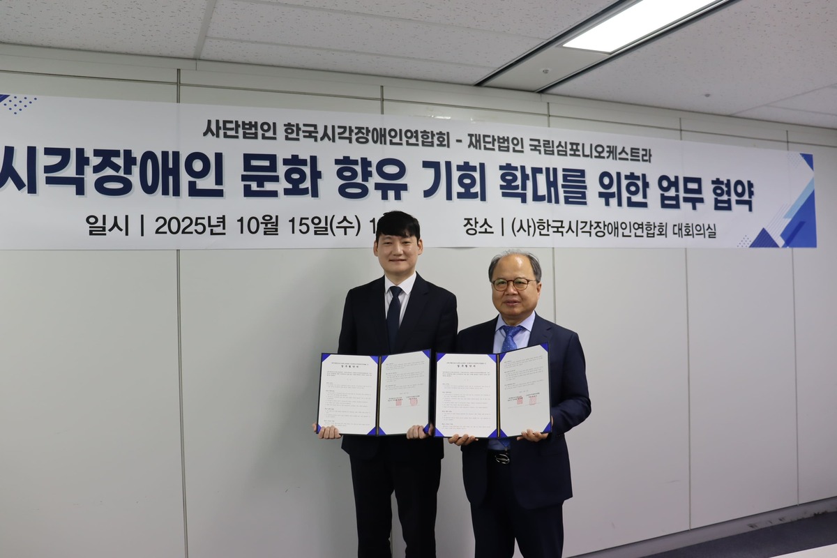 국립심포니오케스트라는 한국시각장애인연합회(회장 김영일)와 문화예술의 공공성 실현 및 시각장애인의 문화 접근성 향상을 위해 업무협약을 15일 체결했다. 이를 통해 시각장애인의 공연 접근성을 강화하고, 문화예술 향유 기회를 넓히는 데 힘을 모을 예정이다.