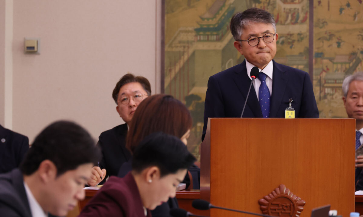 이재필 궁능유적본부장이 16일 서울 여의도 국회에서 열린 2025년도 국가유산청 등에 대한 문화체육관광위원회 국정감사에서 김건희 여사의 종묘 차담회 의혹과 관련한 더불어민주당 민형배 의원의 질의를 듣고 있다. 연합