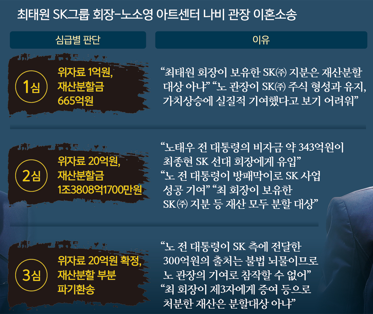 앞서 지난해 5월 2심 재판부인 서울고법 가사2부(당시 재판장 김시철)는 노 전 대통령이 최종현 전 SK 회장(최 회장의 부친)에게 지원한 300억원 중 상당 부분이 태평양증권 인수, 이동통신사업 진출 등 SK그룹의 사업자금으로 사용되거나 최 회장에게 상속되는 등 부부공동재산 형성에 기여했다고 인정했다. 그러면서 노 전 대통령으로부터 자금이 이전된 1991년쯤은 범죄수익은닉규제법이 시행되기 전이어서 300억원을 불법원인급여로 볼 수 없다고 밝혔다.