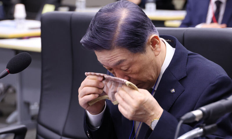 16일 세종시 정부세종청사에서 열린 국회 정무위원회 국정감사에서 여당 의원들로부터 사퇴 압박을 받은 김형석 독립기념관장이 긴장한 듯 손수건으로 얼굴을 닦고 있다. 세종=뉴시스