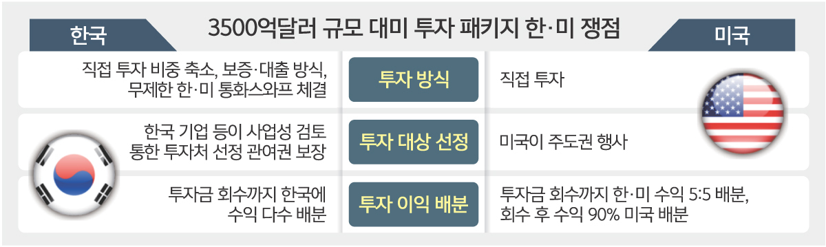 한·미 간 관세협상 타결을 위한 핵심 쟁점은 3500억달러 규모의 대미 투자 패키지 사업 진행 과정에서 한국이 ‘외환시장 안전장치’를 얼마나 확보하느냐다. 한국 정부는 미국의 직접투자 요구에 대응해 무제한 한·미 통화스와프 체결을 요청했지만 미국이 이를 받아들일지는 미지수다. 한국 정부는 미국이 대미 투자에 따른 우리 정부의 외환시장 우려에 일정 부분 공감대를 형성하고 대안을 모색하도록 최대한 양보를 이끌어내는 데 주력하고 있다. 협상단은 미국이 요구하는 직접투자 비중을 최소화하고, 애초 미국에 제안한 보증·대출방식을 통한 투자 비중을 늘리는 데 초점을 맞추고 있는 것으로 전해졌다. 대미 투자 사업 선정 권한, 투자에 따른 원금 회수 방식 등도 미국과 줄다리기가 필요하다.