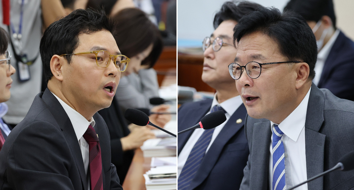 더불어민주당 김우영 의원(오른쪽)과 국민의힘 박정훈 의원이 16일 서울 여의도 국회에서 열린 과학기술방송통신위원회의 원자력안전위원회 등에 대한 국정감사에서 욕설 문자 논란과 관련해 설전을 벌이고 있다. 이날 오전 과방위 국감은 두 의원의 설전으로 감사 중지됐고 오후 시작한 국감도 비공개로 이어졌다. 허정호 선임기자