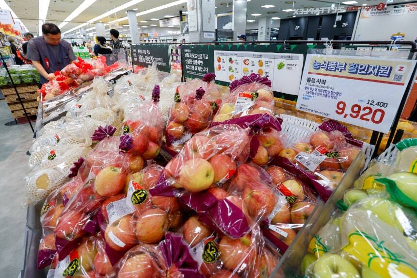 16일 서울시내 대형마트에 농림축산식품부 할인 지원 품목인 홍로 사과와 배가 놓여 있다. 뉴스1