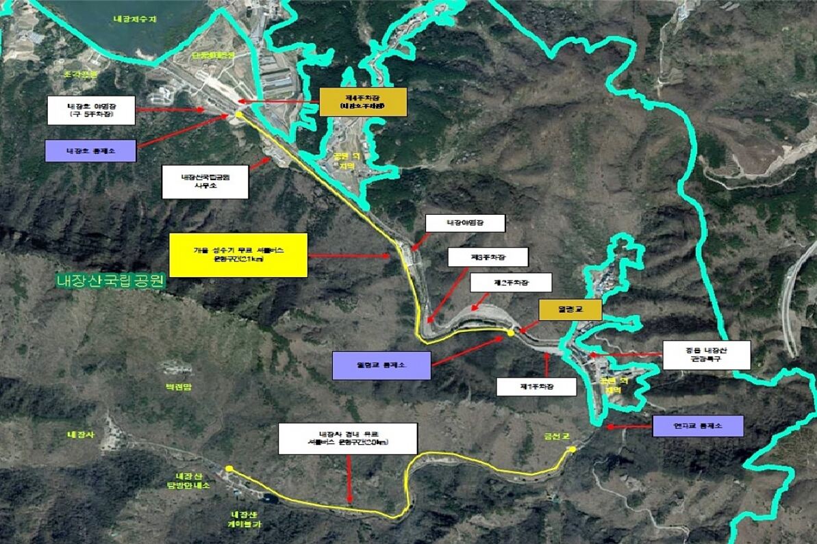무료 셔틀버스는 오는 25일부터 다음 달 16일까지 주말 등 탐방객이 집중되는 시기에 제4주차장(내장호주차장)부터 월령교까지 2.1㎞ 구간을 매일 오전 9시(주말 오전 8시)부터 오후 5시까지 왕복하며, 탄력적으로 운행된다.