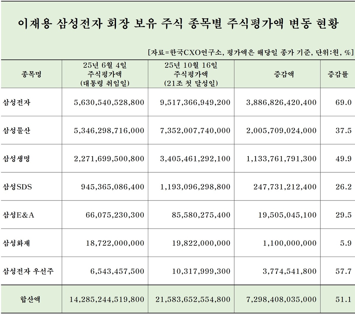 한국CXO연구소에 따르면 이재용 삼성전자 회장은 전날 △삼성전자 △삼성물산 △삼성생명 △삼성SDS △삼성E&A △삼성화재 △삼성전자 우선주까지 총 7개의 주식종목을 보유 중이다. 이들 종목의 평가액은 지난 10일 20조 7178억원이었고, 이후 주식시장 4거래일만에 8658억원이 증가해 21조원대로 진입했다.