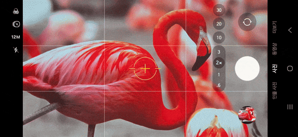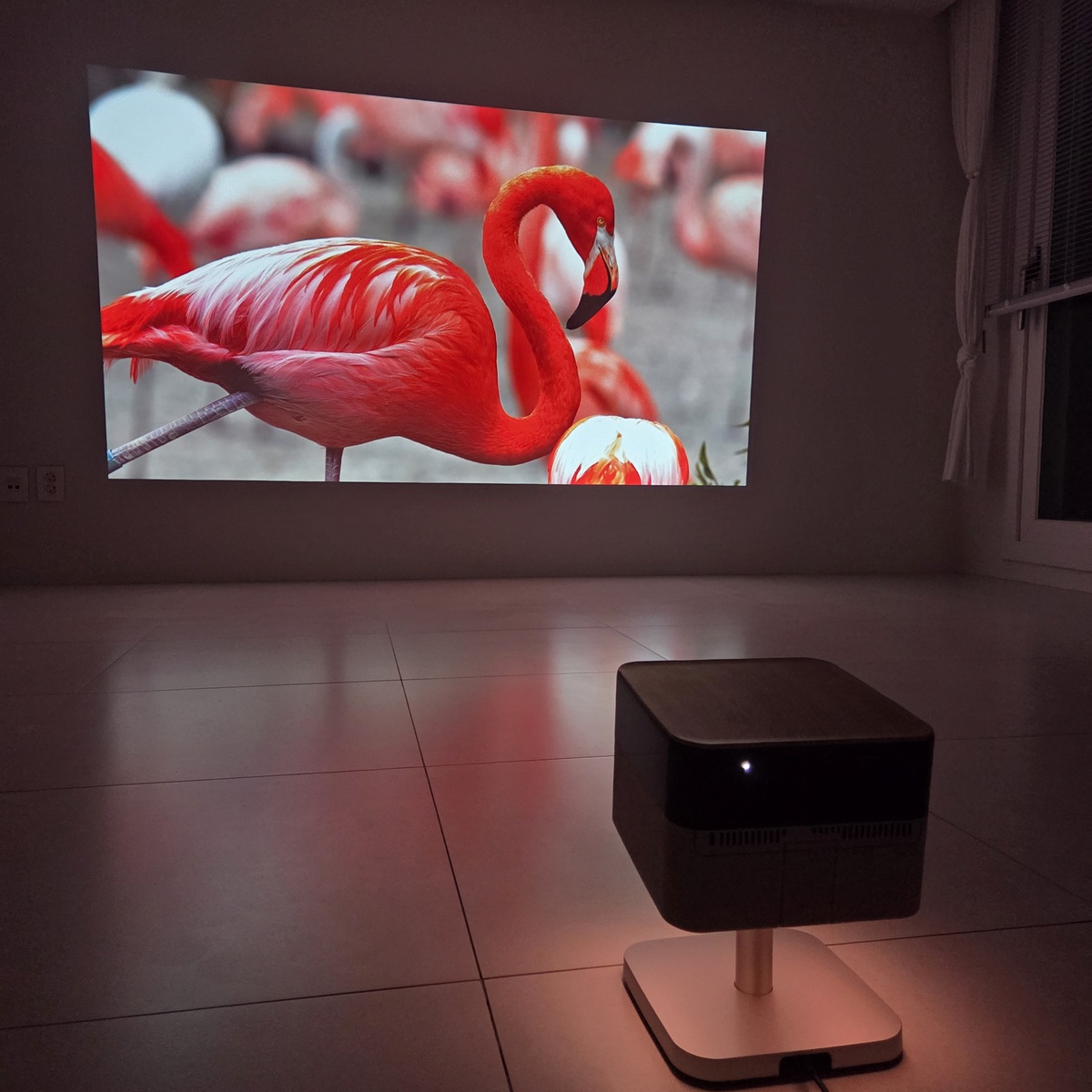 엡손의 휴대용 프로젝터 ‘EF-72’로 3m 떨어진 벽면에 투사한 약 100인치 화면을 스마트폰 카메라로 확대해보는 영상. 플라밍고의 세세한 깃털이 보일 정도로 화질이 선명했다. 이동수 기자
