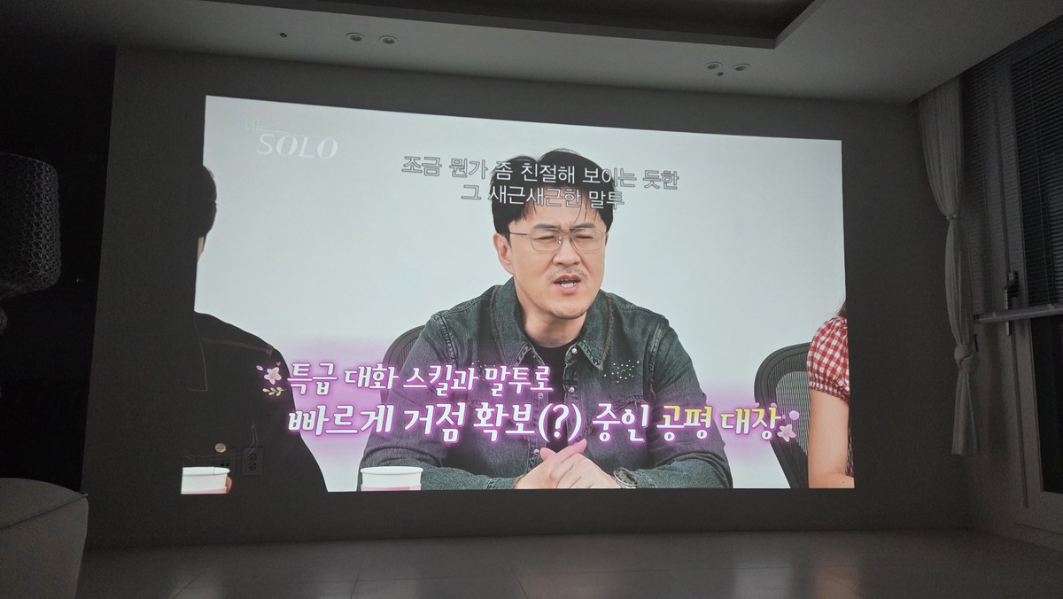 자동 화면 조정 기능도 유용했다. 자동으로 장애물을 피해 화면을 투사하고, 프로젝터와 벽면이 직각을 이루지 않더라도 자동 키스톤 조정 기능으로 어느 곳에 투사하든 깔끔한 직사각형 화면을 볼 수 있었다. 벽면의 색을 인식해 투사 색감을 자동으로 조절하고, 스크린의 프레임에 화면 크기를 알아서 맞춰주는 기능도 있었다.