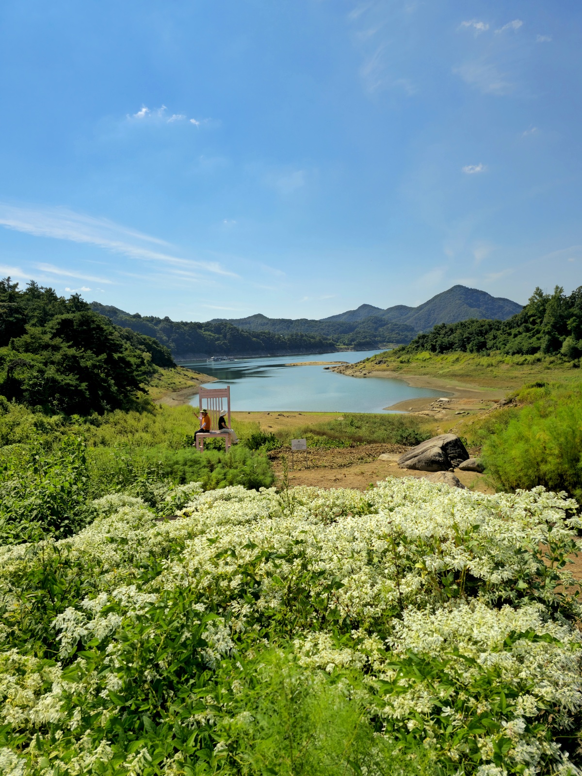수산면 능강리 카페 글루글루에서 여행을 시작한다. 요즘 이곳은 사회관계망서비스(SNS)에서 핫플레이스로 떠올랐다. 청풍호의 아름다운 풍경을 감상하며 여유로운 커피 한 잔을 즐길 수 있어서다. 무엇보다 카페 앞 호수 산책로가 인기다. 드넓게 펼쳐진 하얀 설악초 군락 속에 어른 키를 훌쩍 넘는 핑크색 대형 의자가 포인트로 놓여 연인들이 근사한 인생 사진을 얻을 수 있다. 수백평에 달하는 설악초는 카페 글루글루 주인장이 땅을 매입해 직접 심었다.