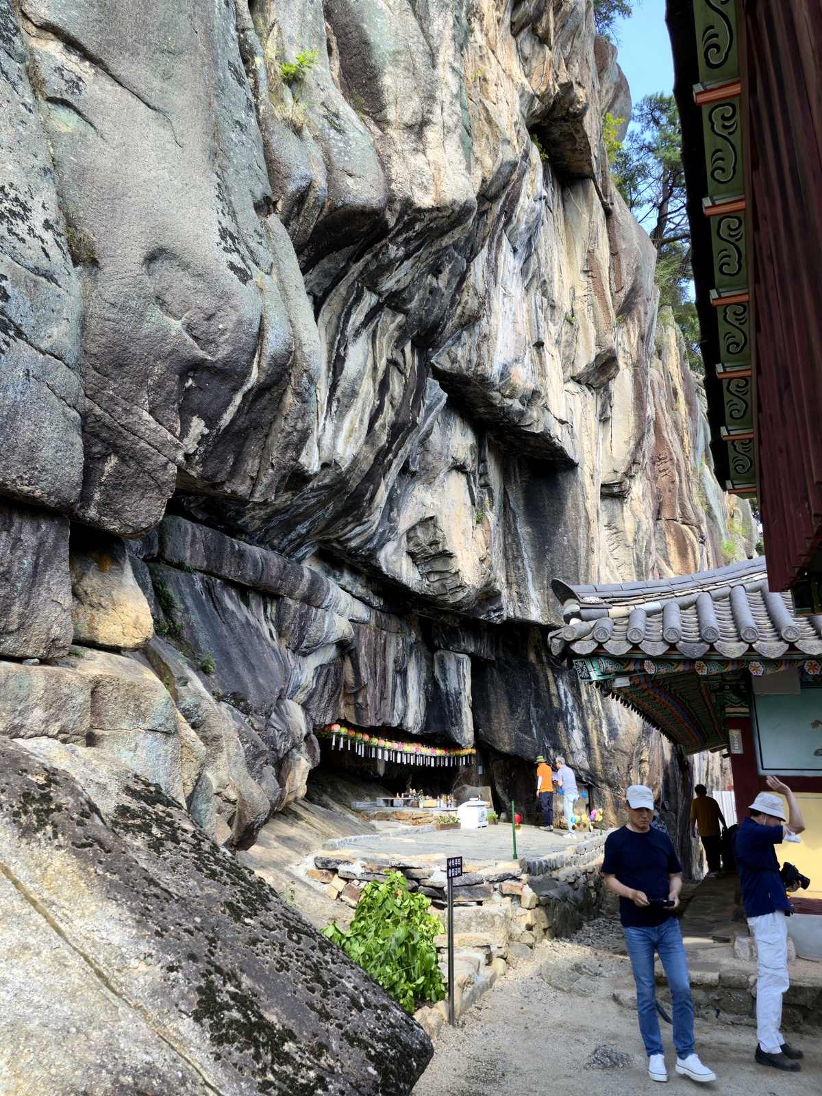 비봉산 정상에서 보이던 아름다운 청풍대교를 건너 구불구불 산길을 20분가량 달리면 깎아지른 신비한 절벽 의상대를 머리에 이고 있는 천년고찰 정방사에 닿는다. 능강교~정방사로 이어지는 제천 청풍호 자드락길 2코스(총거리 1.6㎞·총소요시간 90분)의 종점이기도 하다. 자드락길이란 ‘나지막한 산기슭의 비탈진 땅에 난 좁은 길’이란 뜻. 청풍호 주변의 뛰어난 풍광과 약초 향기 그윽한 산자락을 걷는 길로 모두 7개 코스가 마련돼 있다. 승용차로 정방사 입구까지 갈 수 있다. 주차장에서 10분만 가파른 산길을 오르면 눈이 휘둥그레지는 풍광이 등장한다. 금세 무너질 것 같은 험한 절벽 아래 좁은 길을 따라 정방사가 놓였기 때문이다. 의상대 절벽 밑으로 법당, 칠성각, 유운당, 석조관음보살입상, 석조지장보살상, 산신각, 종각 등이 등장한다.