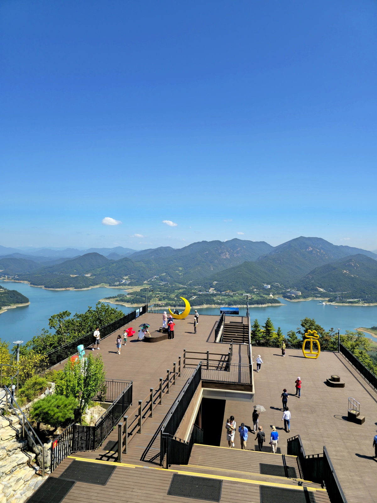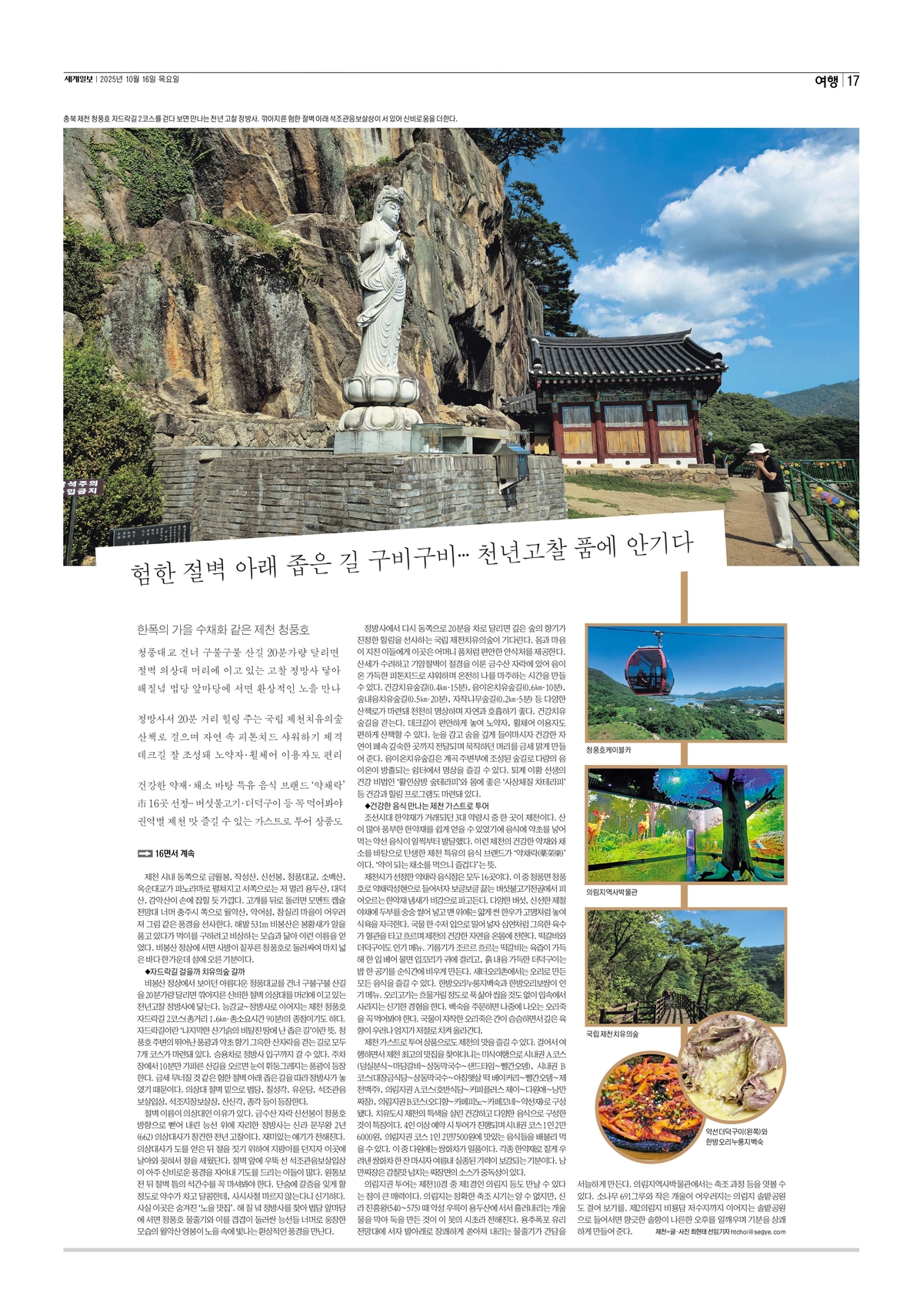 카페 글루글루 앞 정원 하얀 설악초 물결/투명한 청풍호와 어울리는 가을 낭만 가득/청풍호반 케이블카 타고 비봉산 오르면 청풍호 풍경 파노라마로/자드락길 걷다 만나는 절벽아래 정방사 신비/국립 제천치유의숲에선 자연과 호흡하며 힐링/가스트로 투어 이용하면 제천의 맛 풍성하게 즐겨