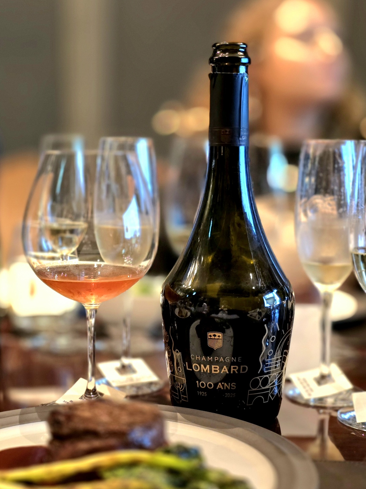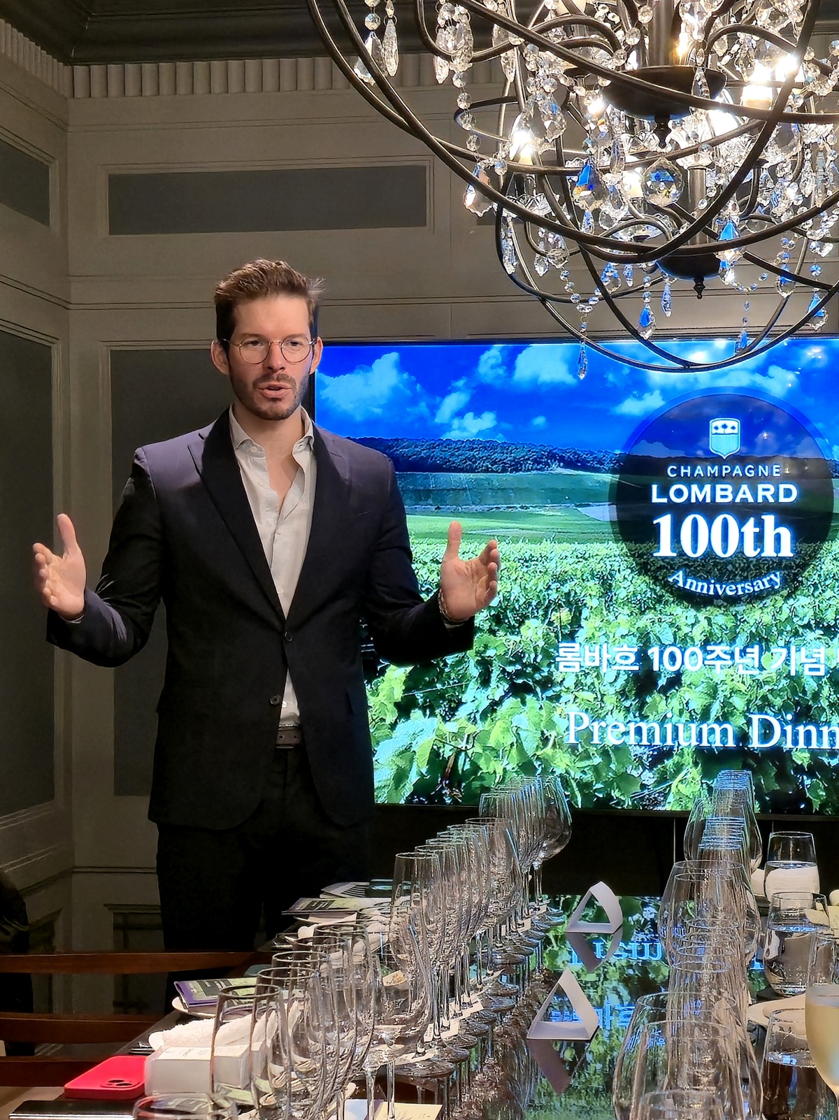 와이너리 설립 100주년을 맞아 4세대 오너 토마 롬바흐(Thomas Lombard)가 한국을 찾았습니다. 롬바흐 샴페인은 비니더스 코리아가 수입합니다. 100주년 와인은 롬바흐 뀌베 센티네르 브뤼 나뚜르 로제 드 세니에 베르즈네 그랑크뤼 ‘레 마르키즈’(Lombard Cuvee Centenaire Brut Nature Rosé de Saignée Verzenay Grand Cru Lieu-dit ‘Les Marquises’)로 2013 빈티지 샴페인입니다. 그랑크뤼 베르즈네 마을에서도 가장 빼어난 레 마르키즈 포도밭에서 생산된 피노누아 100%로 만들며 도사주는 0g/L으로 잔당이 아예 없습니다. 병 숙성 48개월 포함 셀러에서 모두 54개월 숙성합니다. 8시간 동안 껍질과 함께 담가두는 침용을 통해 색상과 풍미를 추출하는 세니에(Saignée·적출) 방식으로 양조합니다. 라즈베리, 딸기 등 붉은 과일의 순수하고 섬세하면서 깨끗한 향으로 시작해 약간 쓴 아몬드, 구운 빵이 더해지고 토양이 선사하는 솔티한 미네랄도 잘 표현됩니다. 돼지고기와 연어·참치·대방어 등 기름기 있는 생선, 조개류, 부드럽고 연한 치즈와 잘 어울립니다. 바디감이 묵직해 스테이크 등 붉은 육류와도 궁합이 좋습니다. 100주년을 맞아 생산된 이 샴페인은 단 545병에 불과합니다.
