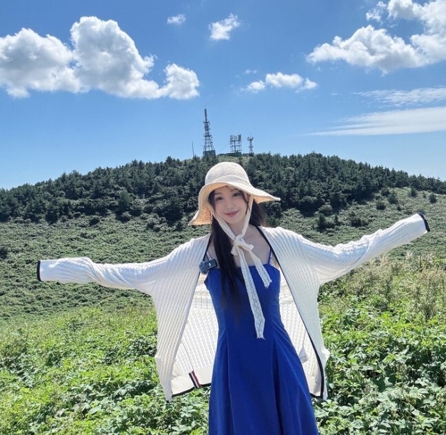 사진 속 남규리는 맑고 푸르른 제주의 자연 풍경 속에서 파란 원피스와 밀짚모자를 쓰고 환하게 미소짓고 있다.