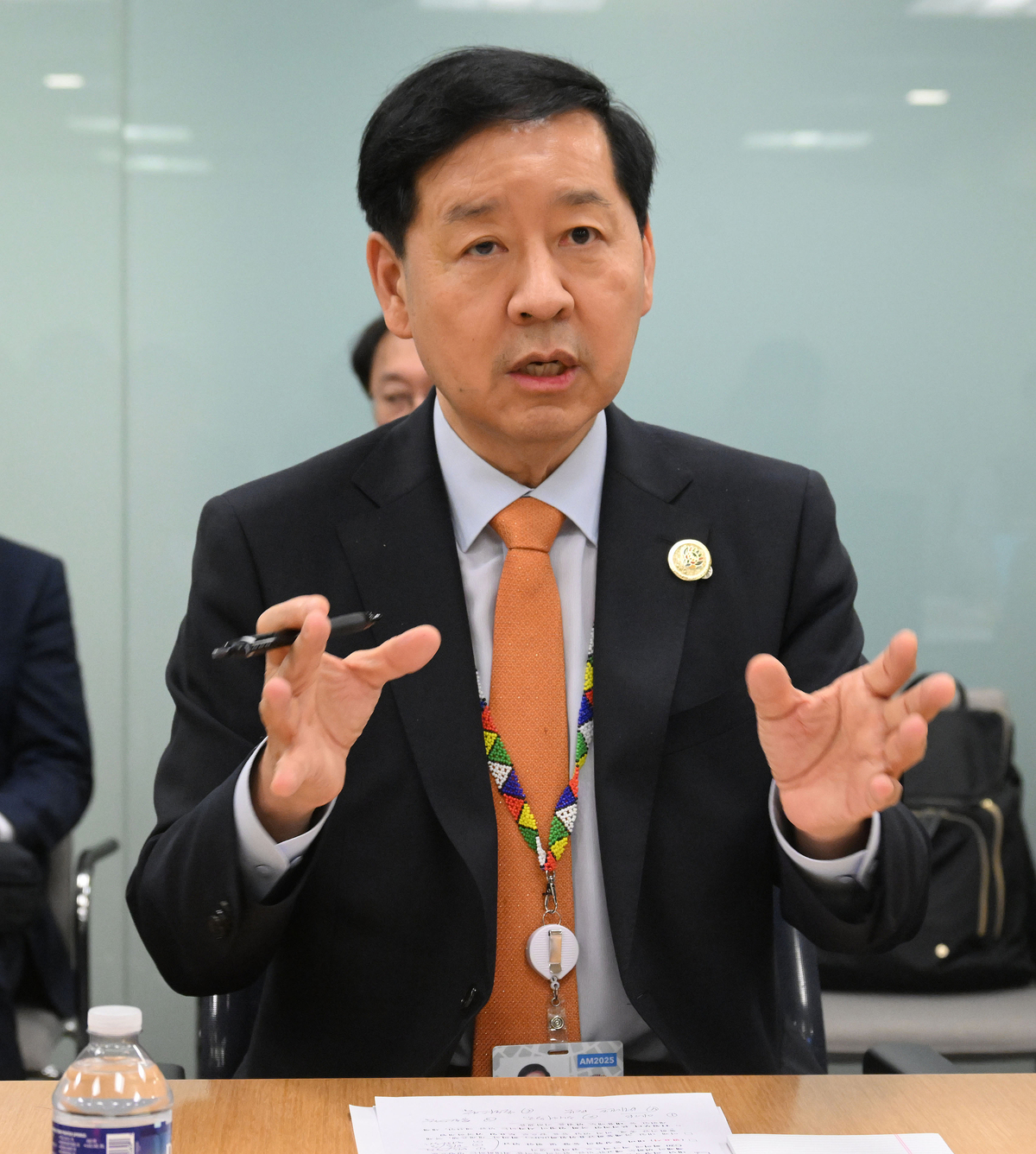 주요20개국(G20) 재무장관회의와 국제통화기금 및 세계은행(IMF/WB) 연차총회 참석차 미국 워싱턴D.C.를 방문중인 구윤철 부총리 겸 기획재정부 장관이 16일(현지 시간) 국제통화기금(IMF)에서 동행기자단과 간담회를 하고 있다. 기획재정부 제공