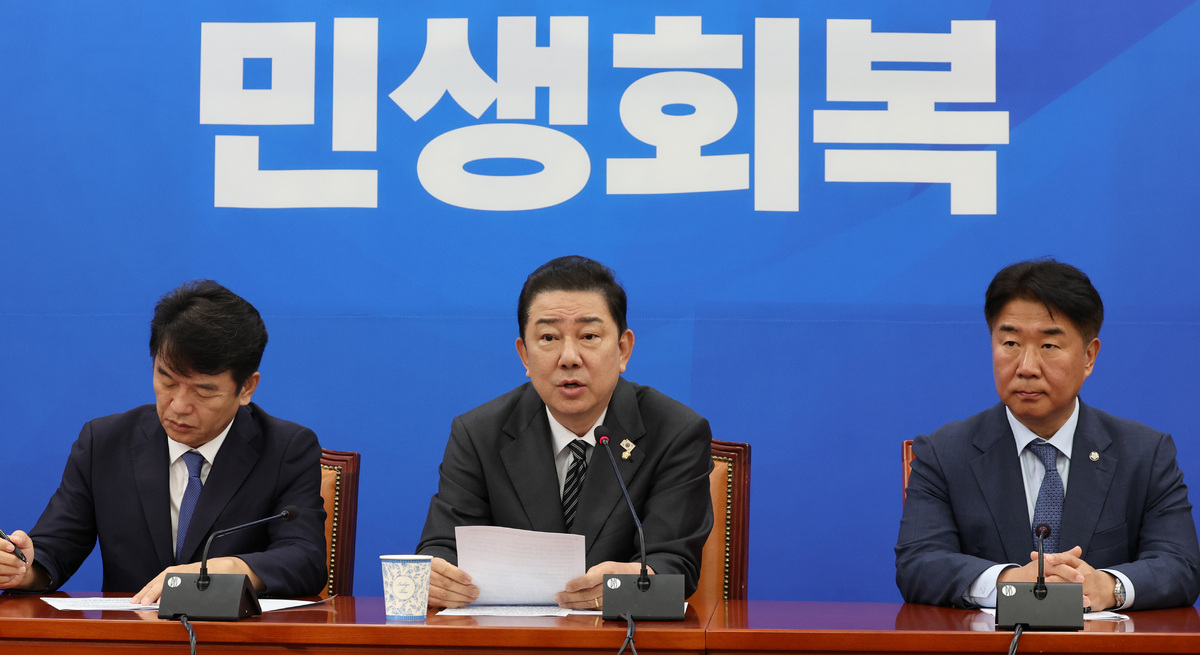 더불어민주당 김병기 원내대표 등이 19일 서울 여의도 국회에서 국정감사 및 현안 관련 기자간담회에서 발언하고 있다. 왼쪽부터 문진석 원내운영수석부대표, 김 원내대표, 이기헌 원내대표 비서실장.