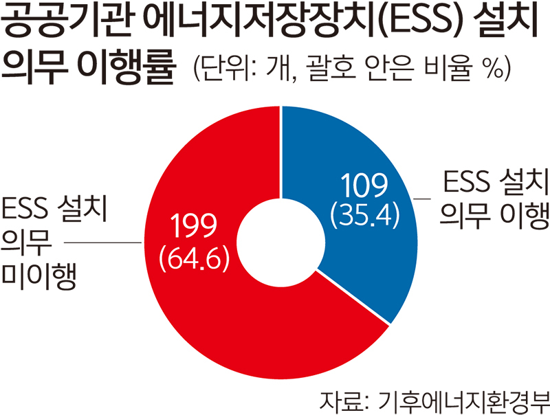 정부가 재생에너지 공급을 확대하면서 에너지저장장치(ESS) 설치량이 매해 100곳 안팎씩 늘어나고 있는 가운데 정작 공공기관은 설치 의무가 있는데도 여전히 이행률이 35% 남짓에 불과한 것으로 확인됐다. 공공기관 ESS 보급을 늘려나가되 사실상 ‘사문화’된 의무화 규정을 현실에 맞게 개정해야 한다는 지적이 나온다.