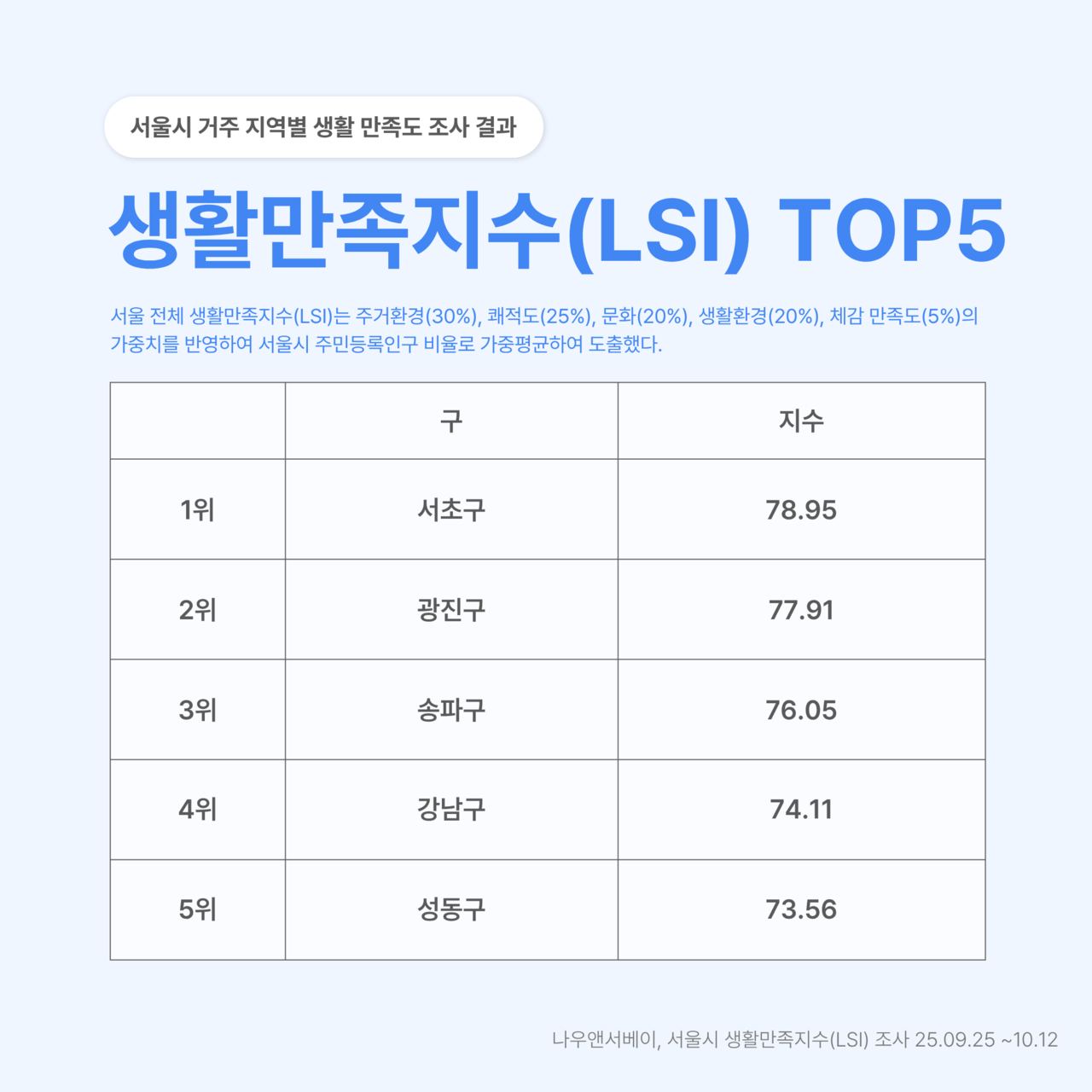 서초구는 주거환경(82.00점)과 문화생활(79.76점)에서 모두 높은 점수를 받았다. 광진구는 주거 쾌적도(78.37점)와 생활환경(75.24점)에서 강점을 보였고, 송파구는 만족도 보정치(82.08점)에서 최고점을 기록했다.