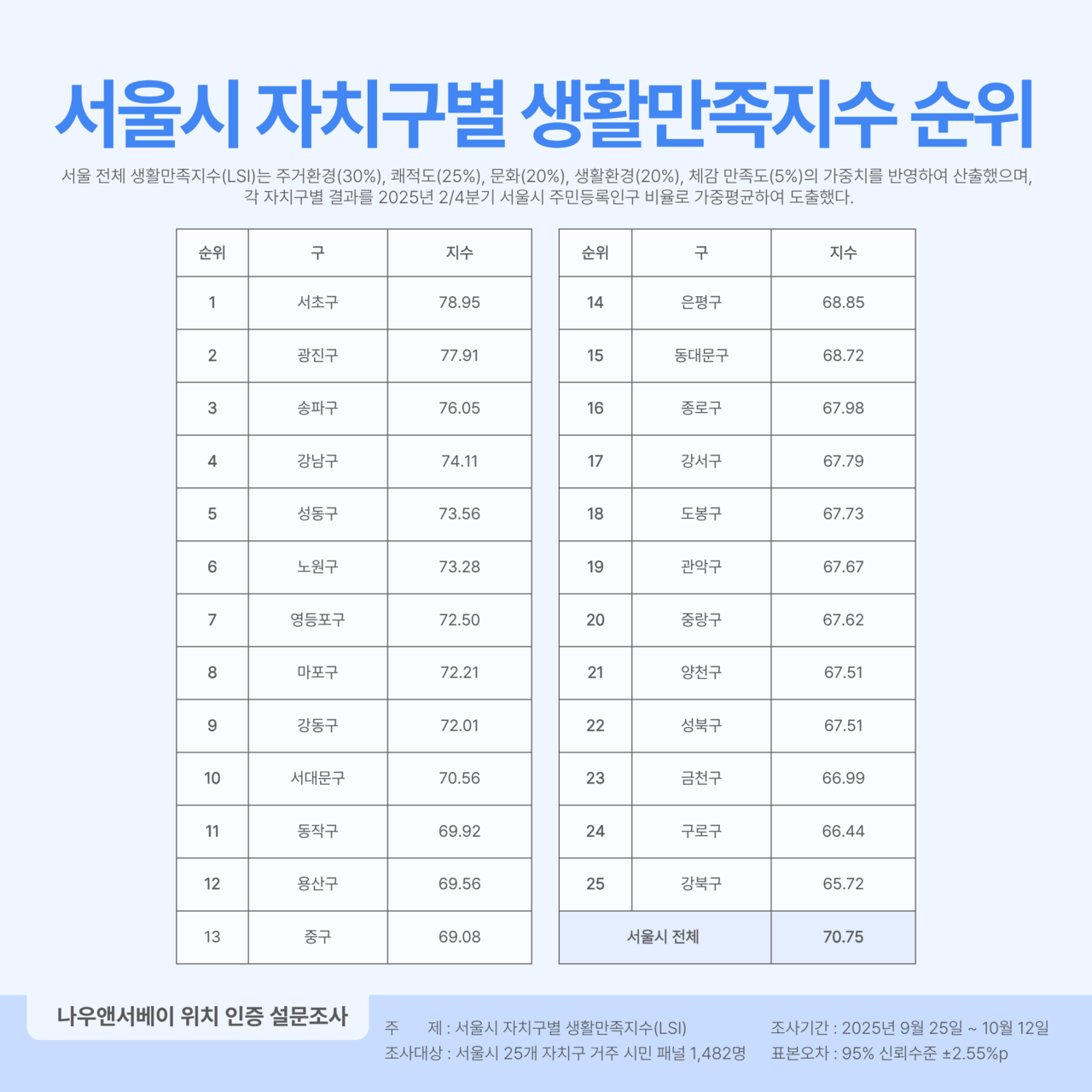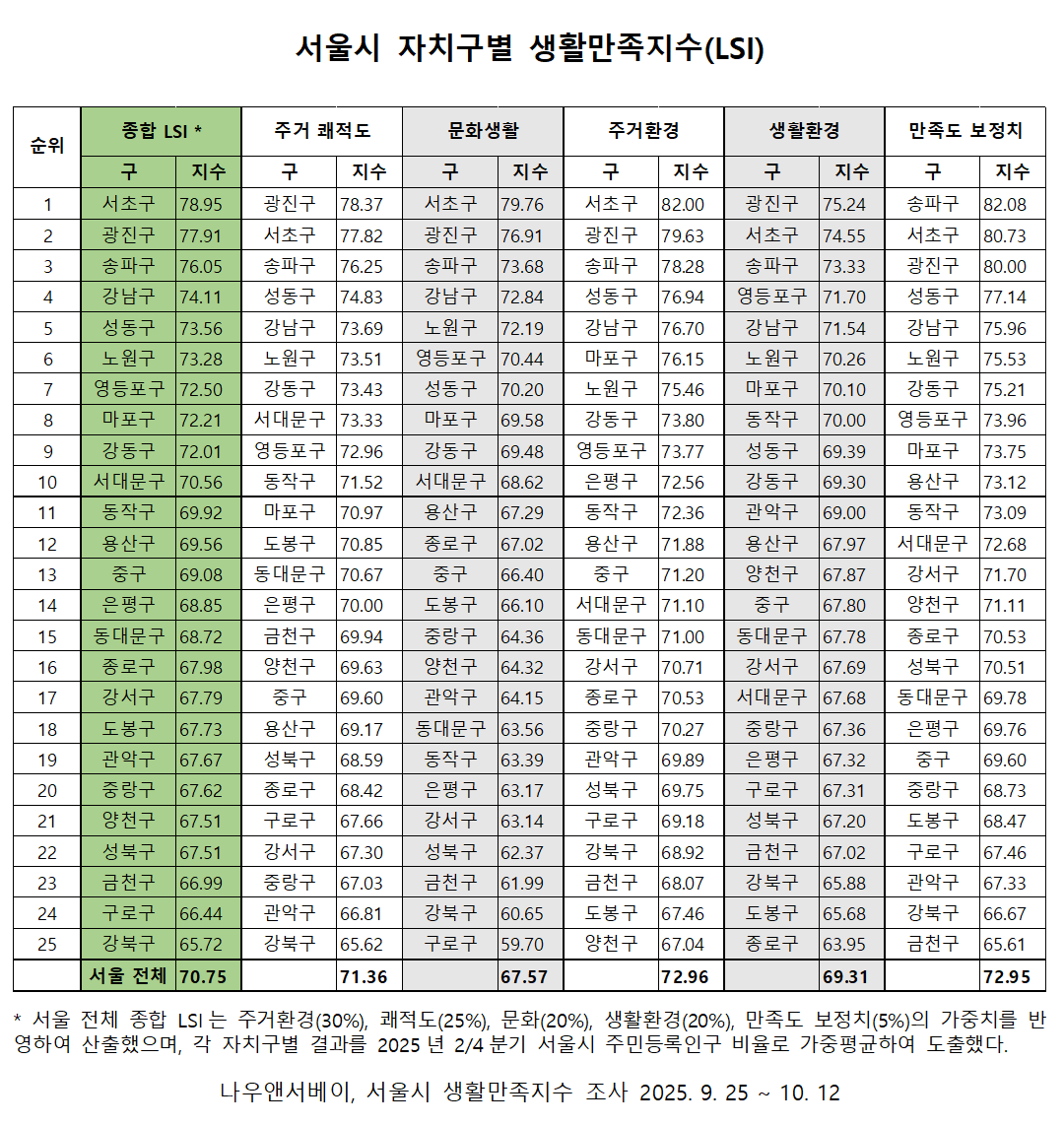 그 결과 서울시 평균 생활만족지수는 100점 만점에 70.75점(100점 만점)으로 집계됐다. 1위는 서초구(78.95점)였다. 이어 광진구(77.91점)가 2위, 송파구(76.05점)가 3위에 올랐다. 강남구(74.11점)는 4위였으며 ‘마용성’으로 불리는 성동구(73.56점)가 5위에 포함됐다. 마포구는 8위, 용산구는 12위였다.
