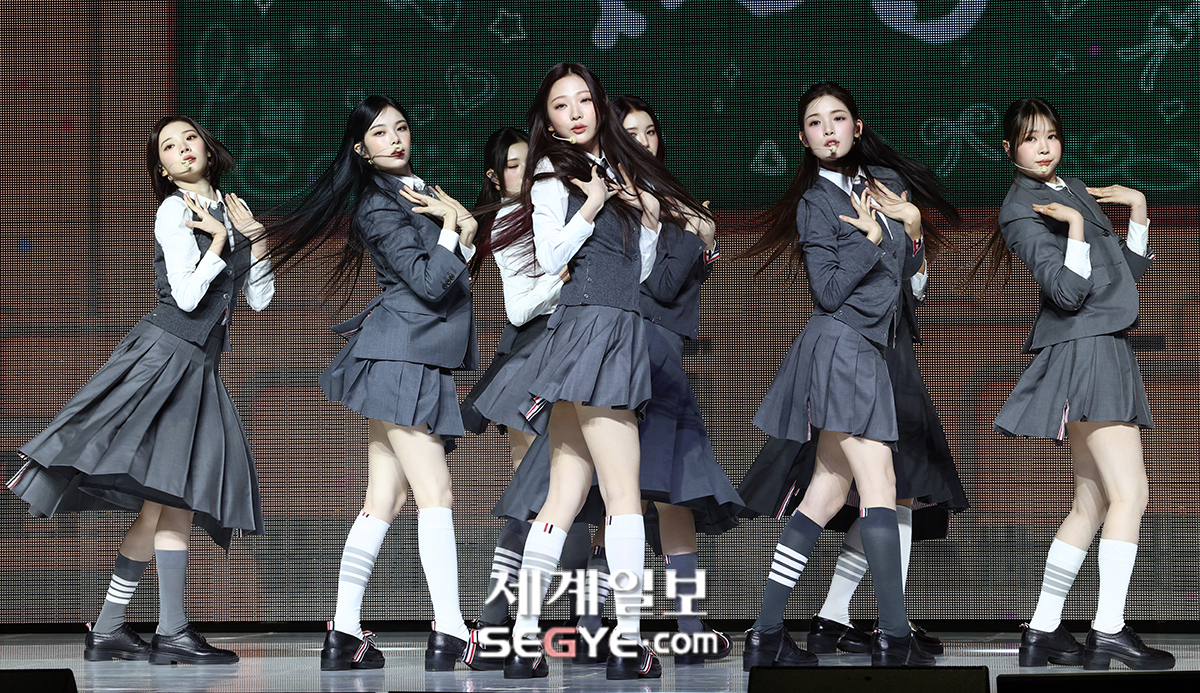 그룹 하츠투하츠가 20일 서울 용산구 한남동 블루스퀘어에서 열린 첫 미니앨범 ‘FOCUS’(포커스)의 쇼케이스에 참석해 열띤 공연을 펼치고 있다.