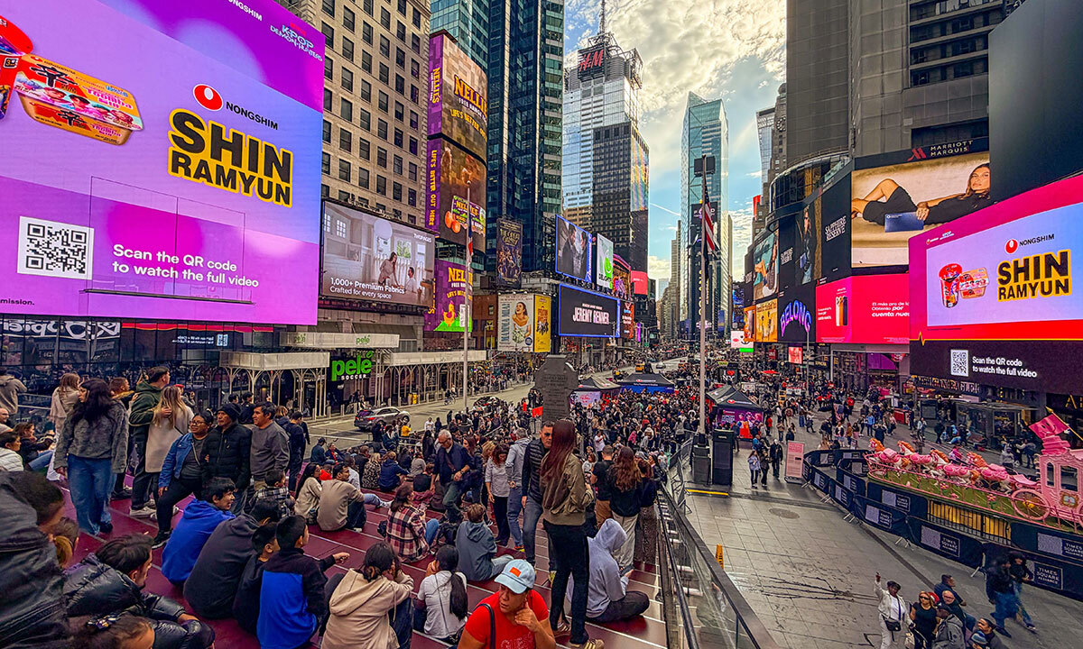 지난 18일 미국 뉴욕 타임스스퀘어 옥외광고판에 넷플릭스 애니메이션 ‘케이팝 데몬 헌터스’와 협업한 농심 신라면의 캠페인이 송출되고 있다. 농심은 이번 캠페인의 일환으로 뉴욕 타임스스퀘어 현장을 방문한 소비자들에게 즉석 라면 조리기로 ‘신라면 툼바’ 시식행사를 진행하는 한편, ‘케이팝 데몬 헌터스’ 캐릭터를 배경으로 사진을 찍을 수 있는 부스를 운영했다고 20일 밝혔다.