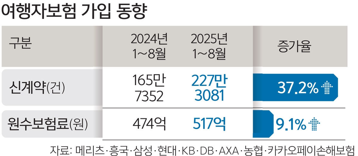 여행자보험 원수보험료는 △2021년 약 98억원 △2022년 300억원 △2023년 675억원 △2024년 826억원으로 매년 증가하는 추세다. 올해 1∼8월 원수보험료는 517억원으로 연말까지 추세가 이어지면 올해 시장 규모가 927억원에 달할 전망이다.