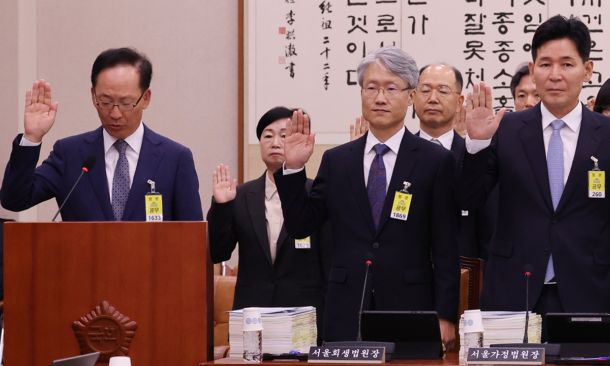 김대웅 서울고등법원장(왼쪽 첫번째) 등 수도권 법원장들이 20일 서울 여의도 국회에서 열린 법제사법위원회 국정감사에 출석해 증인선서를 하고 있다. 허정호 선임기자 기자페이지 바로가기 Copyright ⓒ 세계일보. 무단 전재 및 재배포 금지