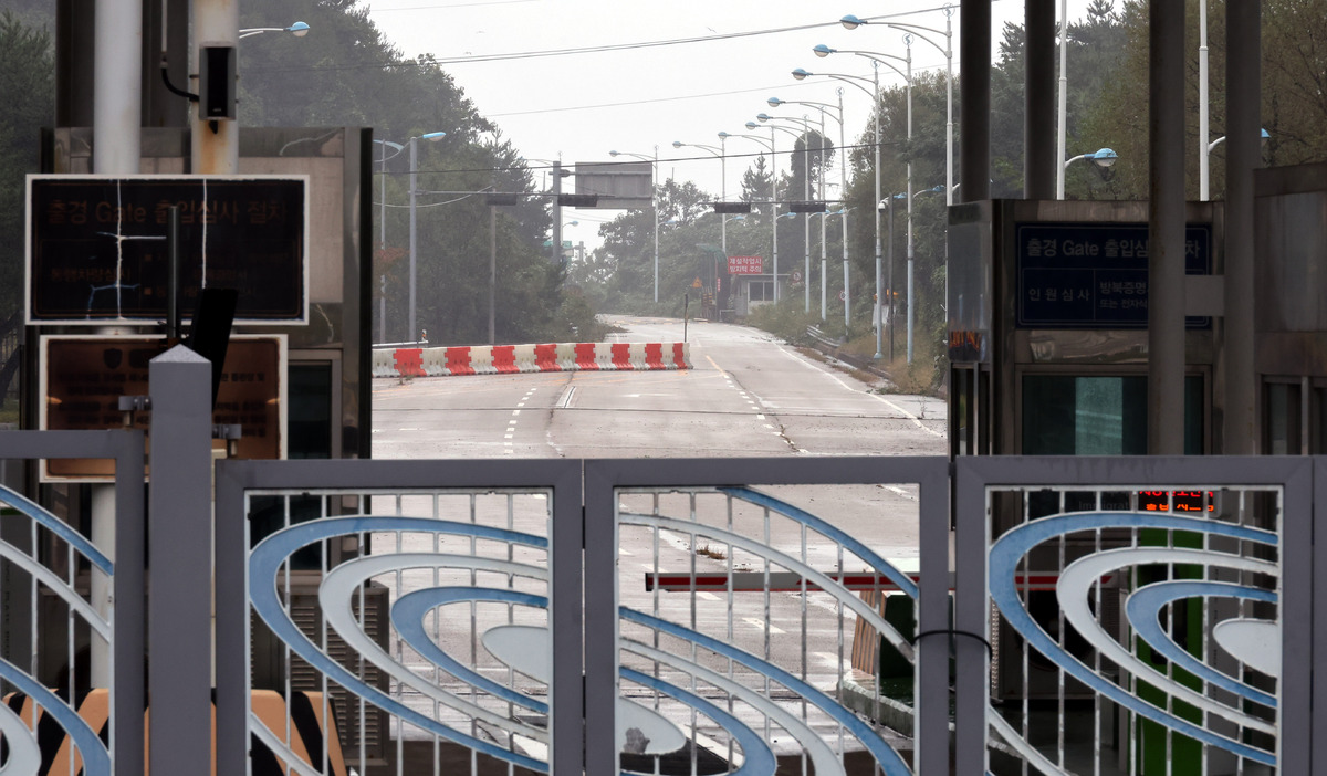 강원 고성군 현내면 동해선 남북출입사무소 남측 지역에서 16일 울타리 너머로 북측 지역으로 나아가는 도로가 텅 비어 있다. 위 작은 사진은 왼쪽부터 17일 경기 파주시 장단면 소재 경의선 남북출입사무소 일대에서 훼손된 채 방치된 도로 표지판, 경의선 남북출입사무소 내 출경 안내 표지판, 16일 강원 고성군 현내면 동해선 남북출입사무소 밖에 세워진 금강산 방면 표지판.