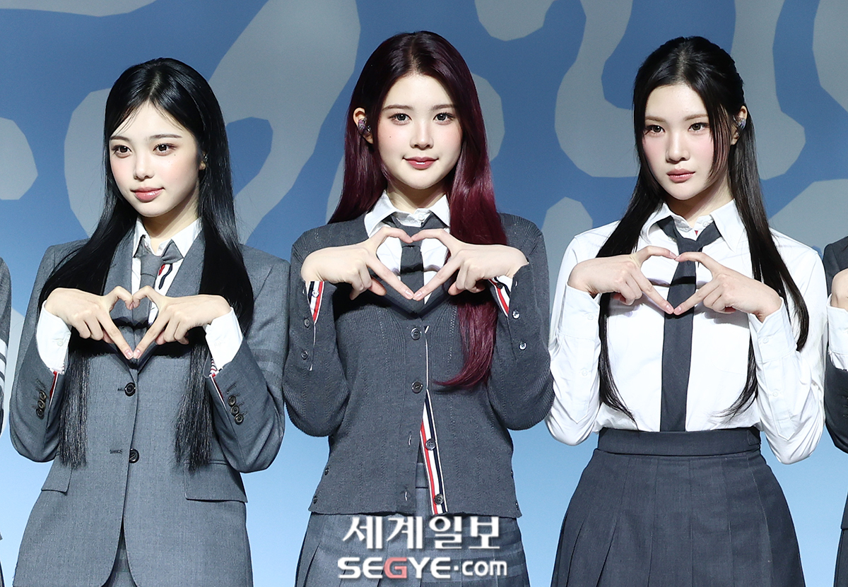 그룹 하츠투하츠 이안, 에이나, 주은(사진 왼쪽부터)이 20일 서울 용산구 한남동 블루스퀘어에서 열린 첫 미니앨범 ‘FOCUS’(포커스)의 쇼케이스에 참석해 포즈를 취하고 있다.