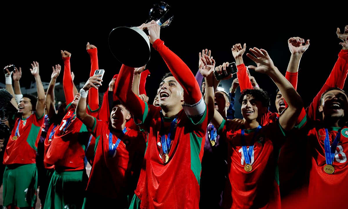 아프리카 축구의 ‘신흥 강자’ 모로코 선수들이 20일 칠레 산티아고의 에스타디오 나시오날 훌리오 마르티네스 프라다노스에서 열린 2025 국제축구연맹(FIFA) 20세이하(U-20) 월드컵 결승전에서 남미 강호 아르헨티나를 2-0으로 꺾고 우승을 차지한 뒤 트로피를 들고 기뻐하고 있다. 모로코가 FIFA 주관 대회에서 우승한 것은 이번이 처음이다. 모로코는 이번 대회 16강에서 한국을 2-1로 꺾었다.