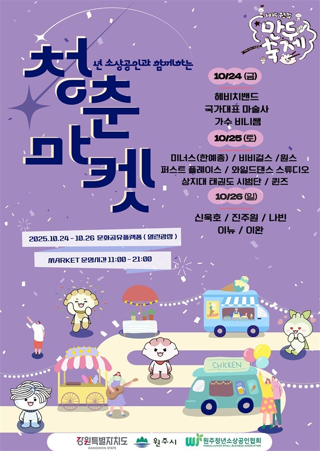 원주시는 원주만두축제 기간인 오는 24일부터 26일까지 중앙동 문화공유플랫폼에서 2025 강원 소상공인 상생 직거래장터 ‘만두축제와 함께하는 청춘마켓’을 운영한다고 21일 밝혔다.