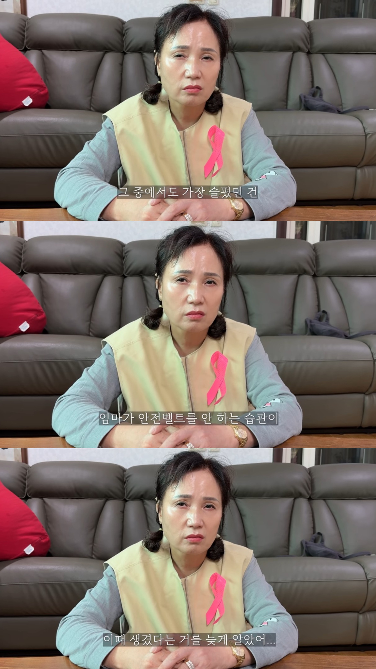 그는 “그중에서도 가장 슬펐던 건 엄마가 안전벨트를 안 하는 습관이 이때 생겼다는 걸 늦게 알았다는 것”이라며 “유방암 환자들은 안전벨트를 하면 자꾸 자극되기 때문에 좋지 않다더라”고 말했다. 그러면서 “안전벨트가 아니라 환자들에게는 위험벨트라는 걸 한동안 내가 잘 몰랐지…”라고 말끝을 흐렸다.