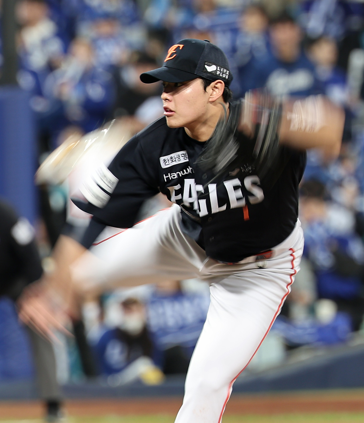 21일 대구삼성라이온즈파크에서 열린 2025 신한 SOL뱅크 KBO 포스트시즌 플레이오프 3차전 한화 이글스와 삼성 라이온즈의 경기, 한화 문동주가 9회말 마운드에 올라 역투하고 있다. 뉴스1