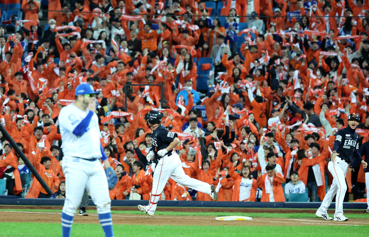 21일 대구 수성구 삼성라이온즈파크에서 열린 2025 신한 SOL 뱅크 KBO 포스트시즌 플레이오프 3차전 한화 이글스와 삼성 라이온즈의 경기, 5회초 2사 주자 2루 상황에서 한화 노시환이 역전 투런 홈런을 친 뒤 그라운드를 돌고 있다. 뉴시스