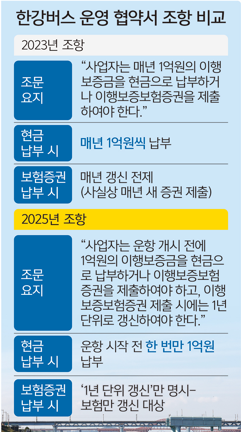 21일 서울시가 조국혁신당 정춘생 국회의원에게 제출한 ‘한강버스 운영사업 업무협약’(2025)에 따르면 제19조(위약금 및 이행보증)에는 “면허·운항시간·안전관리·기타 등과 관련한 협약을 어기고 위약금을 납부하지 않을 경우를 대비해 사업자(한강버스)는 운항 개시 전 1억원의 이행보증금을 현금으로 납부하거나 이행보증보험증권을 제출해야 한다”는 내용이 명시돼 있다. 또 “이행보증보험 증권 제출 시에는 1년 단위로 갱신해야 한다”고 규정돼 있다.