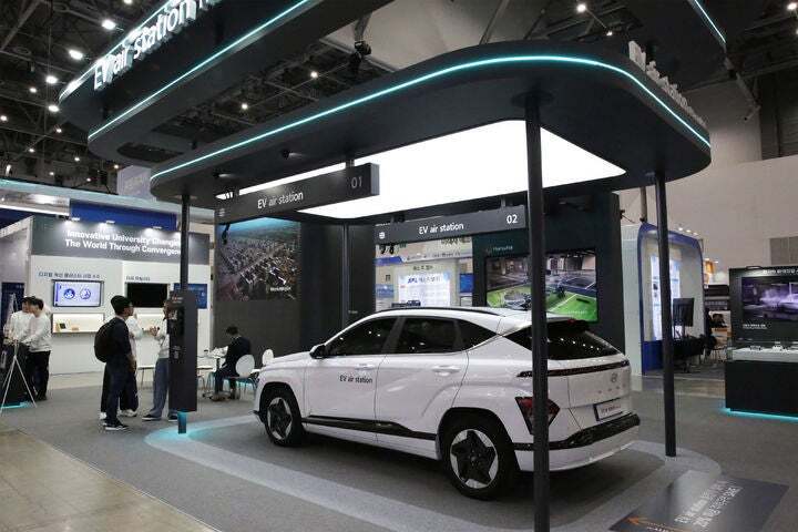 ㈜한화 건설부문은 22일부터 25일까지 대구 엑스코에서 열리는 '2025 대한민국 미래모빌리티엑스포'(DIFA)에 참가해 화재감지 기능을 강화한 차세대 천장형 전기차 충전 시스템 'EV air station'(EV 에어스테이션)을 선보였다.