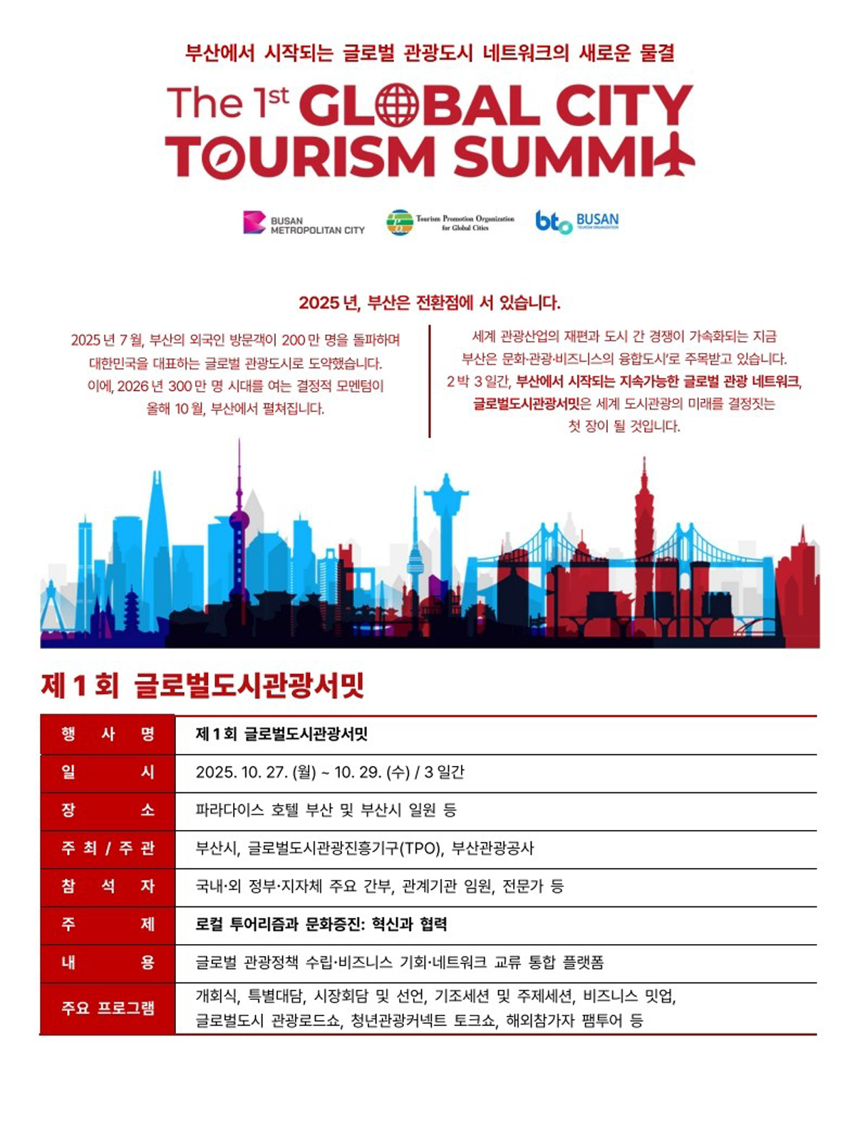 시는 글로벌도시관광진흥기구(TPO), 부산관광공사와 공동으로 이번 서밋을 통해 도시 간 관광 협력의 새로운 방향을 제시하고, ‘글로벌 관광허브도시 부산’ 실현을 위한 중장기 관광정책 비전을 모색할 예정이다. 서밋에는 14개 국가 22개 도시의 관광정책 관계자와 국제기구, 관광관련 학계·업계 고위급 인사 400여명이 참석한다.