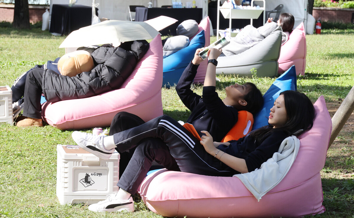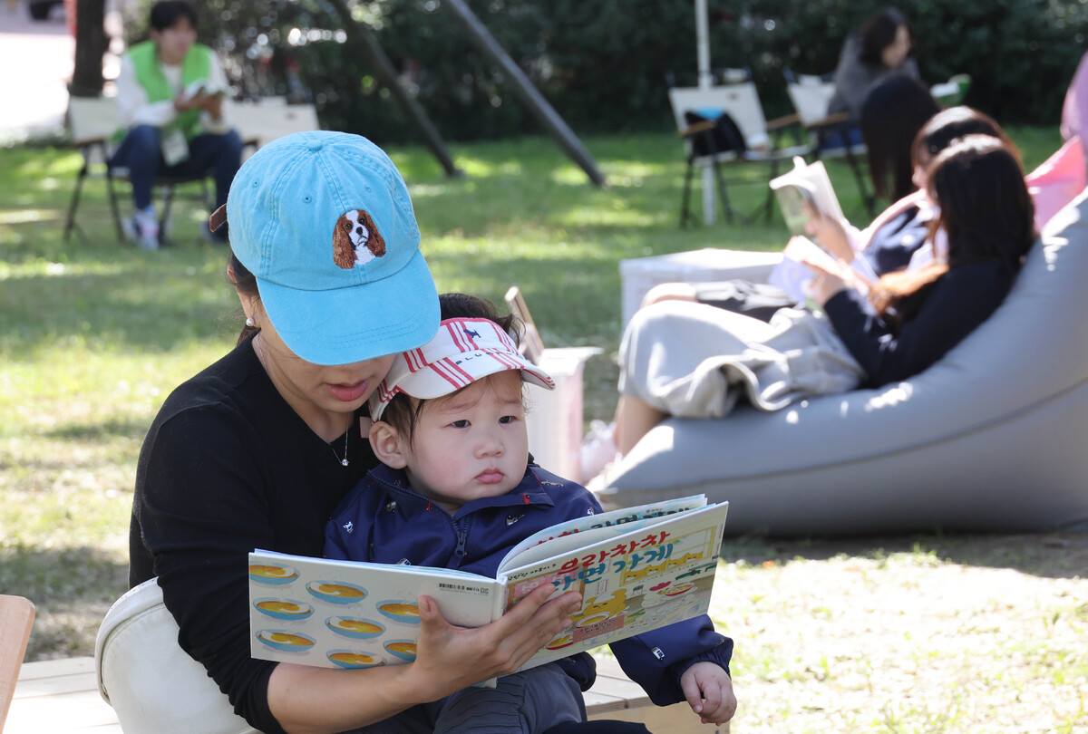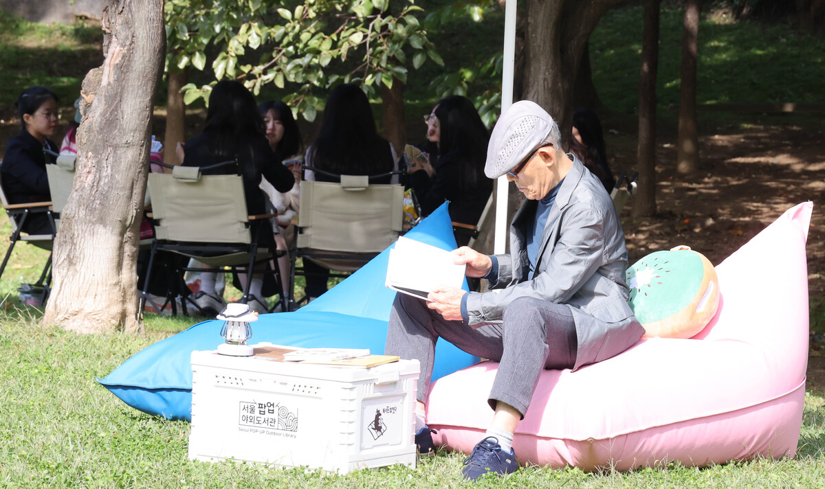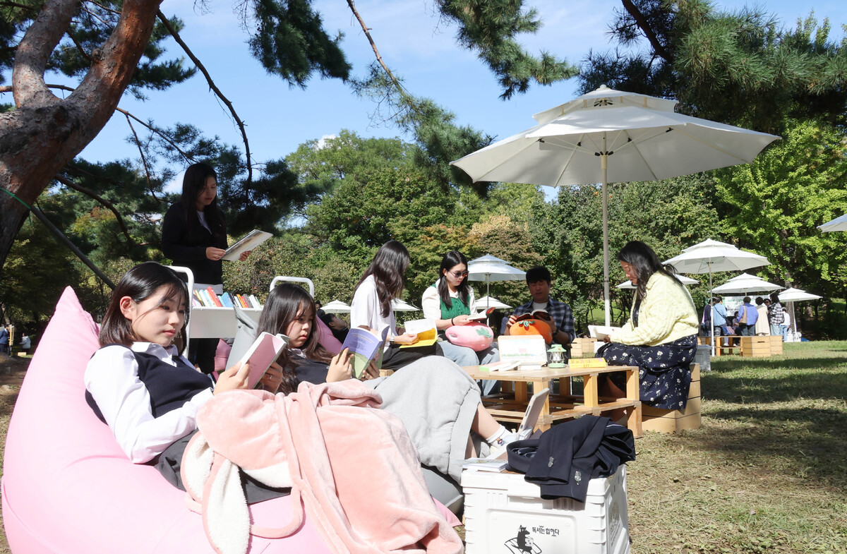 23일 서울 송파구 아시아공원에 마련된 야외도서관을 찾은 시민들이 책을 읽으며 즐거운 시간을 보내고 있다. 송파구청은 가을 독서의 계절을 맞아 동네 공원을 책과 문화가 어우러진 복합문화공간으로 조성해 야외도서관을 운영한다.
