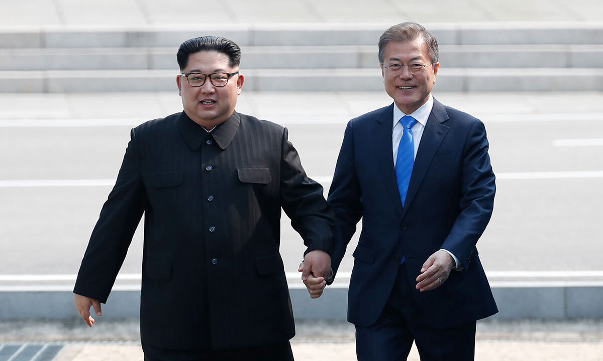 지난 2018년 4월 27일 문재인 대통령과 북한 김정은 국무위원장이 판문점 군사분계선 북측으로 넘어갔다가 다시 남측으로 넘어오고 있다. 연합뉴스