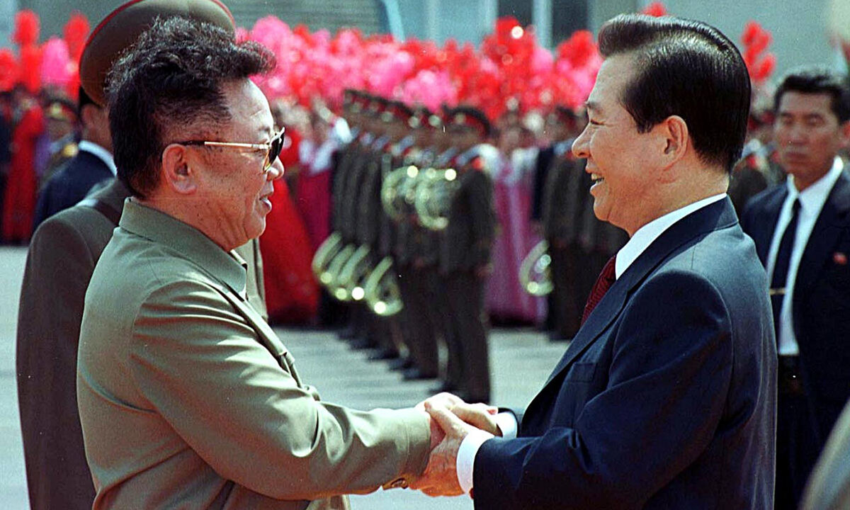 지난 2000년 6월 13일 평양순안공항에 도착한 김대중대통령과 직접 영접나온 김정일국방위원장이 밝은 표정으로 역사적인 악수를 하고 있다. 평양=사진공동취재단