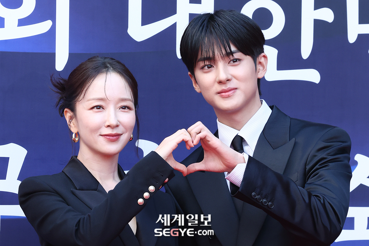 아나운서 박선영(사진 왼쪽)과 배우 김민규가 23일 서울 중구 장충동 국립극장에서 열린 ’제16회 대한민국 대중문화예술상’ 레드카펫 행사에 참석해 포즈를 취하고 있다.