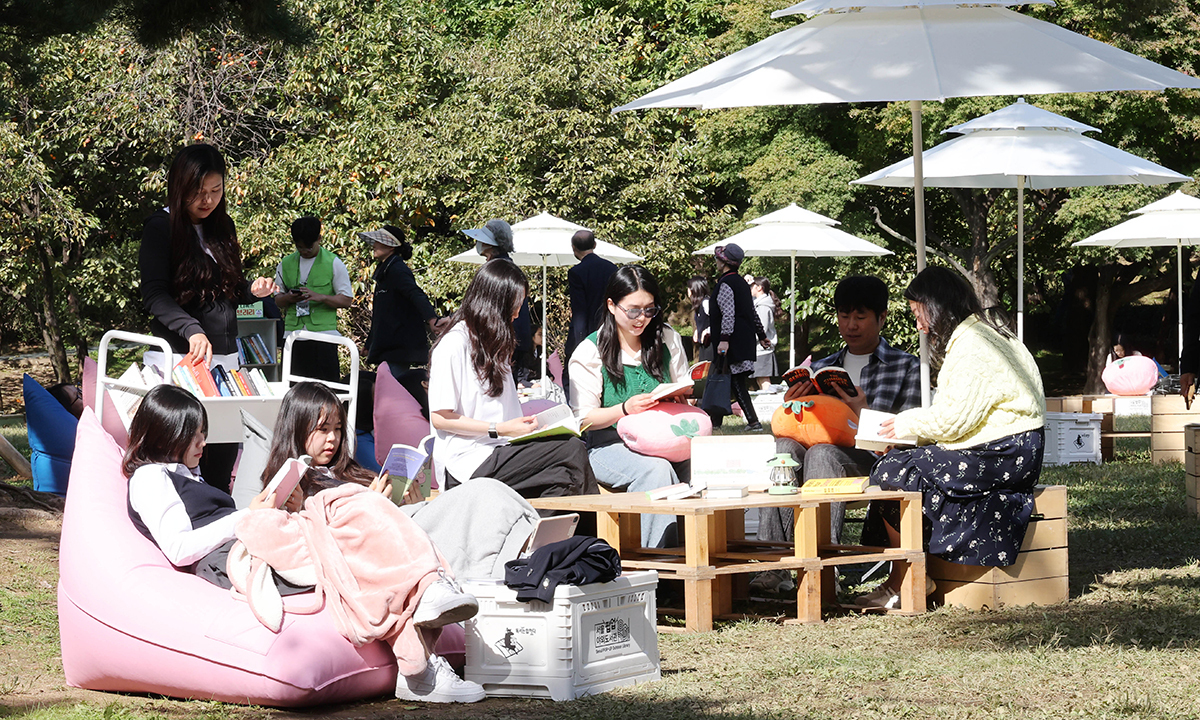 23일 서울 송파구 아시아공원에 마련된 야외도서관을 찾은 시민들이 책을 읽으며 즐거운 시간을 보내고 있다. 송파구청은 독서의 계절을 맞아 동네 공원을 책과 문화가 어우러진 복합문화공간으로 조성해 야외도서관을 운영한다.