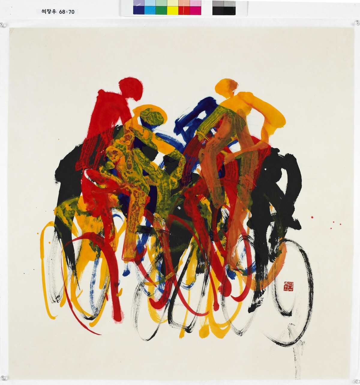 그가 순간의 생명력을 포착하는 ‘수묵크로키’ 신작을 이번에 새롭게 선보인다. 코로나 시기에 작업했던 작품과 2023년 울산 고래재단에서 선보였던 46회 개인전의 주요 작품들을 다시 공개해 그의 예술 여정을 입체적으로 조망할 수 있다. 서예와 크로키를 결합한 ‘석창우식 수묵크로키’는 전통과 현대, 신앙과 예술이 교차하는 한국 미술사에 유례없는 독창적 화풍으로 평가받는다. 서예의 필획이 지닌 호흡과 집중의 정신에, 서양 드로잉의 스피드와 생명감을 결합한 이 표현은 전통 수묵화의 미학을 완전히 새롭게 해석한 시도였다. 그는 한 획, 한 붓질 속에 인체의 운동, 순간의 긴장, 생명의 떨림을 담는다. 피겨선수의 회전, 경륜선수의 질주, 무용수의 몸짓은 그의 붓 아래서 생생히 살아난다. 비평가들은 그의 작업을 두고 “대상의 혼을 포착한다”고 말한다. 그의 선(線)은 묘사가 아니라 행위이며, 시각이 아닌 ‘체험으로서의 드로잉’이다. 빠른 속필과 격렬한 농담의 대비는 마치 현장의 생중계를 보는 듯한 박진감을 자아내며, 동양화의 고요한 명상성에 역동적 에너지를 부여한다.